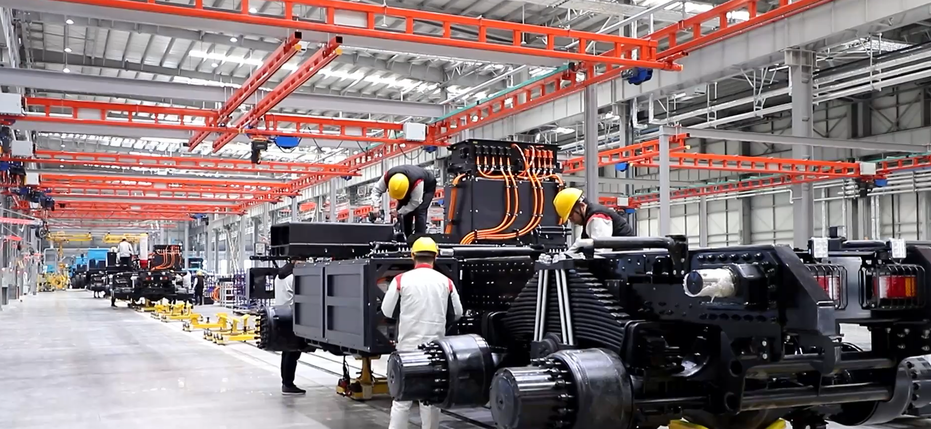 据介绍,长城重工新能源宽体车产线,沿用了汽车生产线构建理念,但又因工程机械的多品种、小批量特性,跟汽车有所不同。该产线共包含17个工位,分工不同又协调统一。