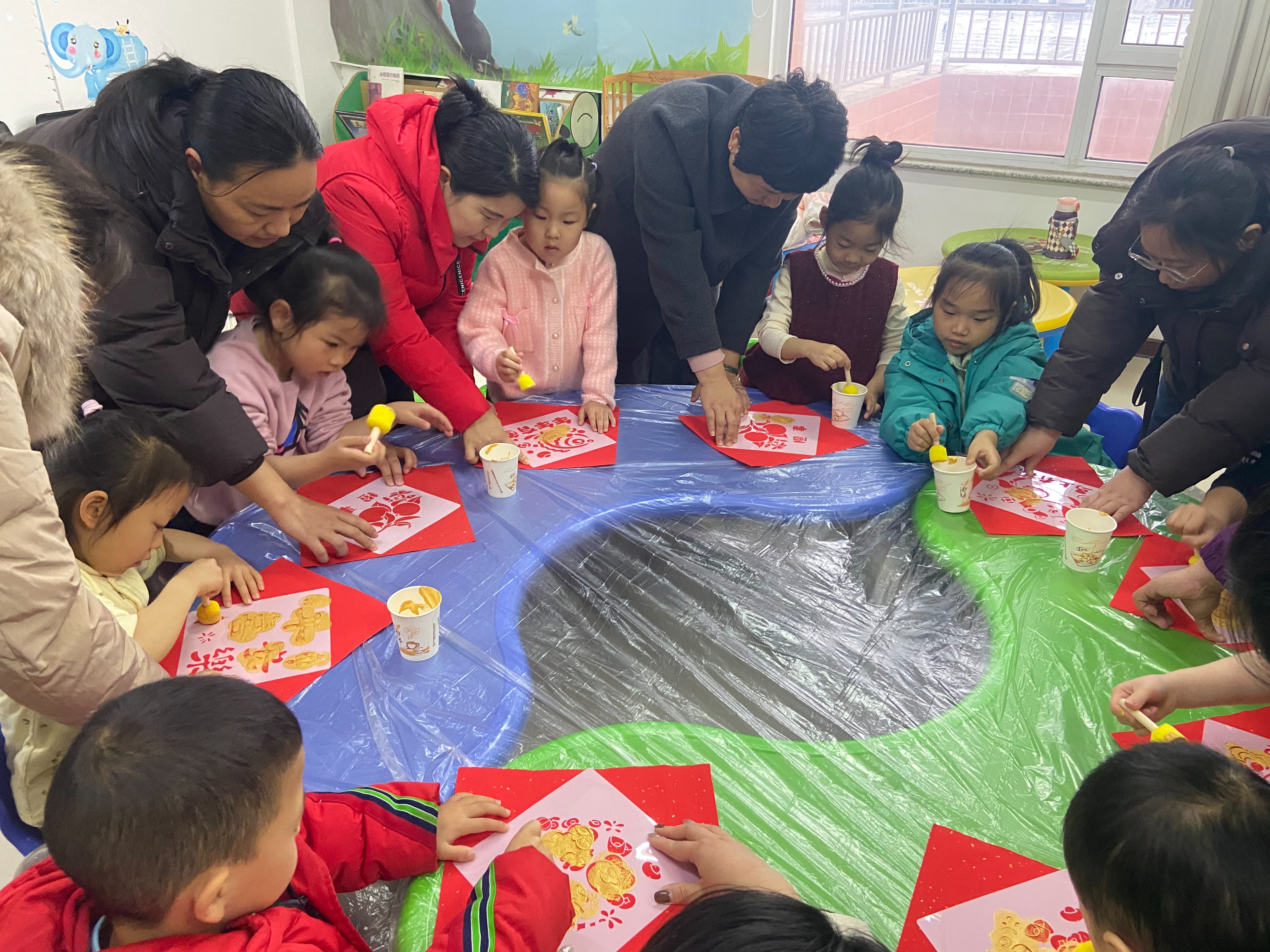 故事结束后,孩子们迎来了期待已久的手工拓印环节。赵永丽首先示范操作:将雕刻精美的模板轻轻覆盖在大红纸上,用海绵锤蘸取金灿灿的丙烯颜料,沿着模板镂空处均匀拍打。当模板缓缓揭开,祝福语“平安喜乐”金光闪耀,瞬间点燃了孩子们的热情。