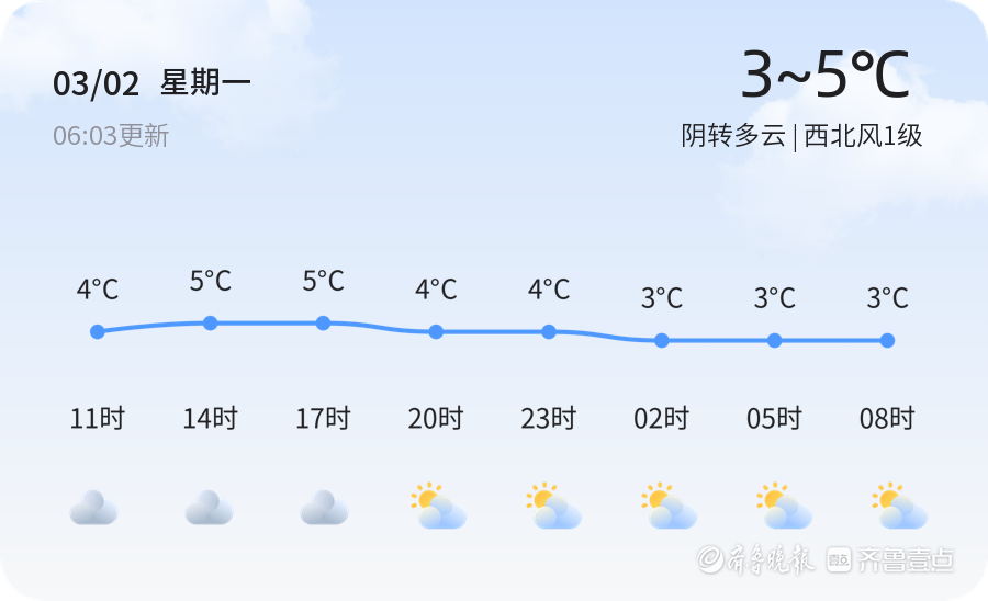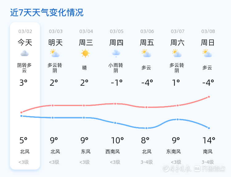未来三天,潍坊市天气趋势总体平稳。周三(3月4日)天气晴朗,气温维持在2℃至9℃之间;周四(3月5日)将迎来小雨转阴天气,气温有所波动,最低气温为-1℃,最高气温为10℃,市民需注意防寒保暖;周五(3月6日)天气多云,北风风力增强至3-4级,气温范围为-4℃至8℃。提醒市民根据天气变化适时增减衣物,尤其是周四的小雨天气,出行时请携带雨具,注意交通安全。