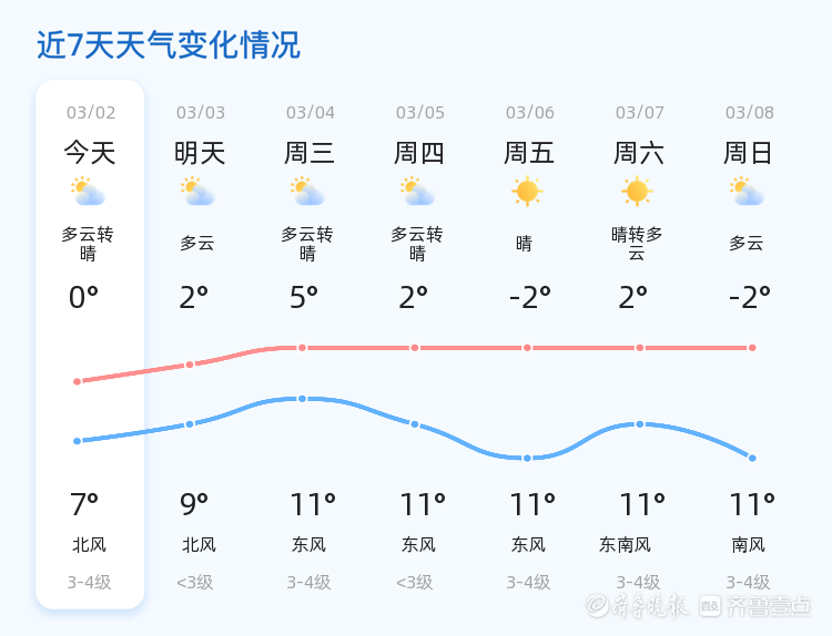 今天是3月2日,星期一,农历正月十四。济宁市今日天气多云转晴,气温在0℃到7℃之间,北风3级,空气湿度为100%,PM2.5指数为23,空气质量良好。各区天气情况基本一致,市民出行需注意保暖。