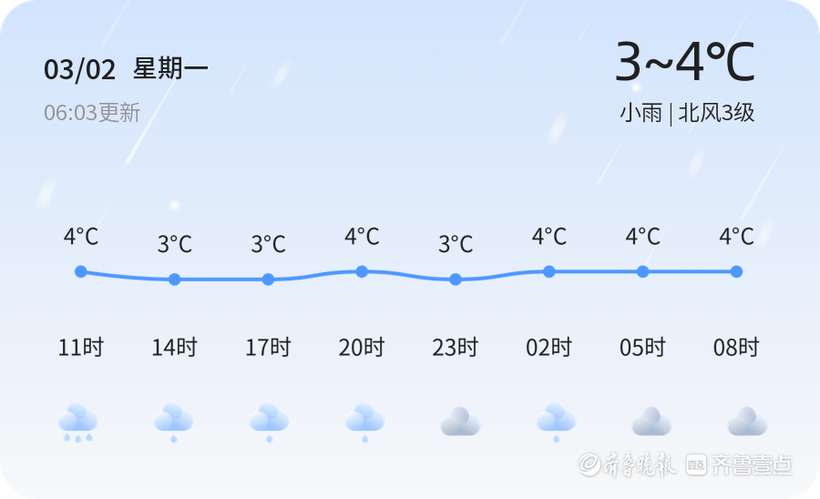 今天是3月2日,正月十四,烟台市迎来小雨天气,气温在3至4摄氏度之间,北风3级,空气湿度高达9.5浓度为68微克/立方米,空气质量为良。今天的天气以小雨为主,市民出行时需携带雨具,注意防寒保暖,以应对湿冷天气带来的不适。由于路面湿滑,驾车出行时请减速慢行,确保行车安全。未来三天,烟台市天气多变,气温在2至6摄氏度之间波动。明天将以多云天气为主,气温稍有回升,但风力较大,阵风可达3-4级。后天天气晴朗,但温度较低,市民需注意保暖。周四将迎来雨夹雪天气,道路可能湿滑,市民出行时请注意安全,及时关注天气变化。温馨提示