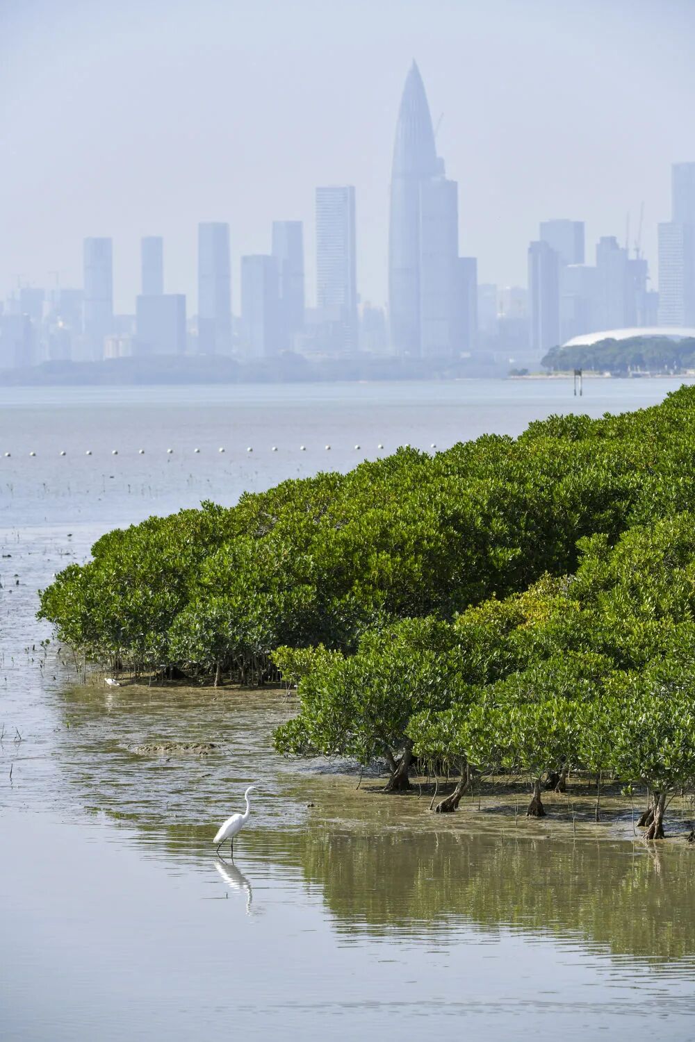 在深圳,红树林湿地与城市的高楼大厦形成人与自然和谐共生的景象。新华社记者 梁旭 摄
