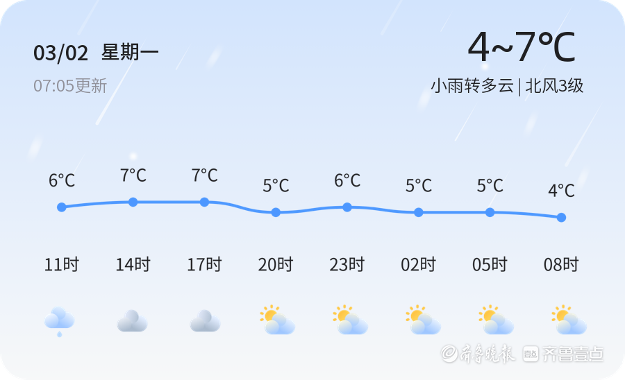 今日是2026年3月2日,星期一,农历正月十四。日照市今日天气为小雨转多云,气温介于4℃至7℃之间,北风3级,空气湿度90%。空气质量指数PM2.5为33,属于优级,适合户外活动。市民出行时建议携带雨具,注意防寒保暖。