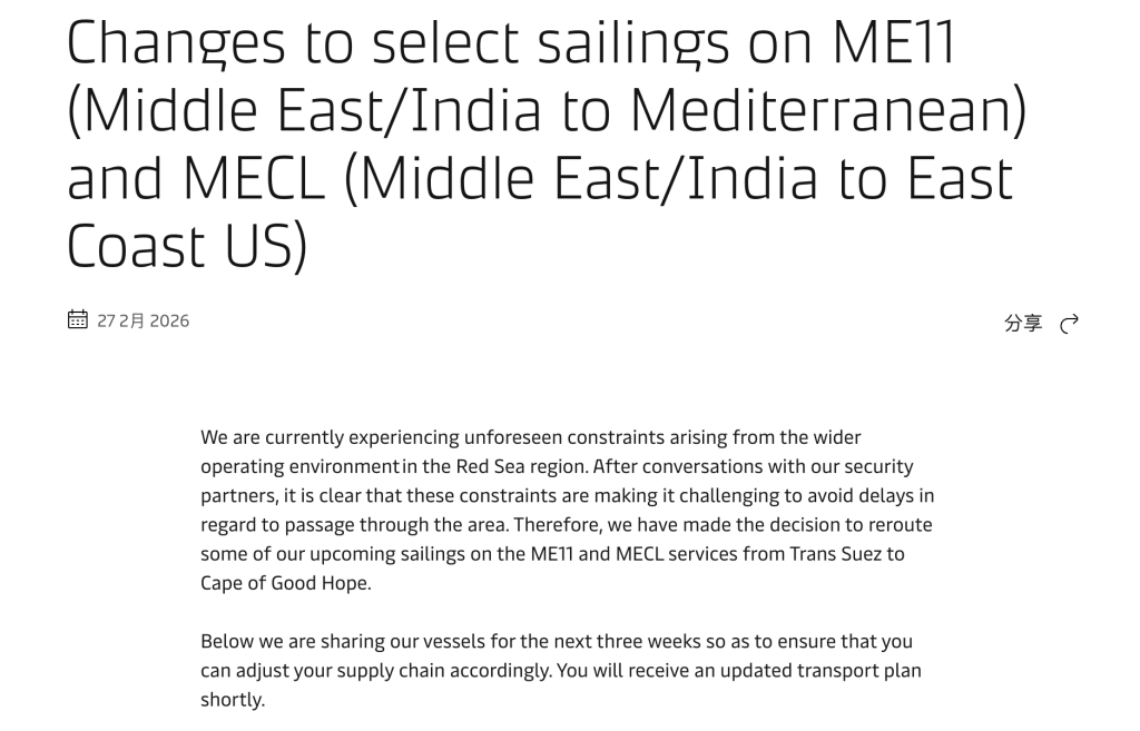 马士基方面,当地时间2月27日发布通知称,“我们目前正面临红海地区运营环境的突发限制。与我们的安全合作伙伴沟通后,我们了解到这些限制会导致难以避免的船期延误。因此,我们决定将ME11和MECL航线近期的部分航次从苏伊士航线改道至好望角。此次调整是因红海地区运营环境的突发限制而采取的临时措施。在所有其他MECL和ME11航次上,我们仍将优先选择苏伊士航线,因为这仍然是我们最快、最可持续且最高效的服务客户的方式。”