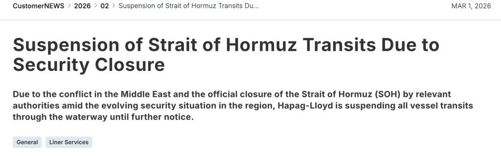 当地时间3月1日,德国集装箱航运公司赫伯罗特在官网发布声明称,鉴于中东地区冲突持续,且当地相关部门因区域安全局势不断升级,正式关闭霍尔木兹海峡,赫伯罗特宣布暂停所有船舶通过该航道,直至另行通知。此外,声明中还指出,途经阿拉伯湾港口的航运服务可能会出现延误、改道或时刻表调整。公司正在努力将影响降至最低,并将尽快通知受影响货物的任何重大变更。
