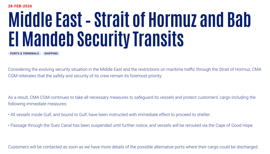 当地时间2月28日,法国达飞海运集团(CMA CGM)在官网发布公告称,鉴于中东地区不断变化的安全局势及霍尔木兹海峡海上交通管制,集团将继续采取一切必要措施保障船舶及客户货物安全。即刻起,所有位于海峡内及驶往海峡的船舶均已接到指令,前往安全区域避险。此外,暂停向苏伊士运河通行,直至另行通知;相关船舶将改道经好望角航行。一旦确定可供卸货的备选港口,集团将第一时间与客户联系。
