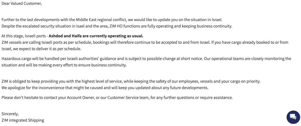 2月28日,总部位于以色列的航运企业以星航运(ZIM)在官网发布公告称,尽管以色列及周边地区的安全形势升级,但ZIM总部各项职能均正常运转,以确保业务连续性。目前,以色列的阿什杜德港和海法港运营一切正常。以星航运的船舶按计划停靠以色列港口,因此公司将继续接受往返以色列的订舱。如果已预订往返以色列的货物,公司预计将按计划交付。