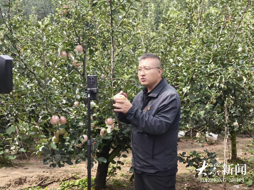 柴沟镇北张家屯村村支书张承友在果园内直播。