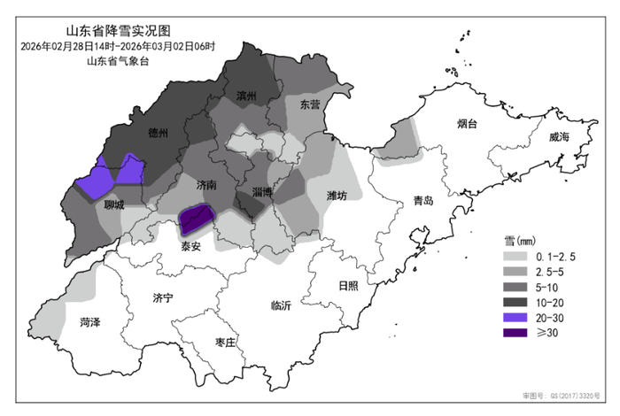 从3月1日6时至2日6时这24小时的降雪情况来看,全省共有10市、55县(市、区)出现降雪,平均降雪量3.7毫米。各市平均:德州13.5毫米、聊城9.8毫米、滨州8.6毫米、泰安6.2毫米、淄博5.9毫米、济南5.3毫米、东营4.9毫米、潍坊1.7毫米、烟台0.3毫米和菏泽0.3毫米,其他市无降雪。降雪量前3位的是:泰安泰山37.3毫米、聊城临清23.6毫米和聊城高唐20.9毫米。最大积雪深度排前4位的是:泰安泰山23厘米、德州本站12厘米、德州陵城12厘米和聊城冠县12厘米。
