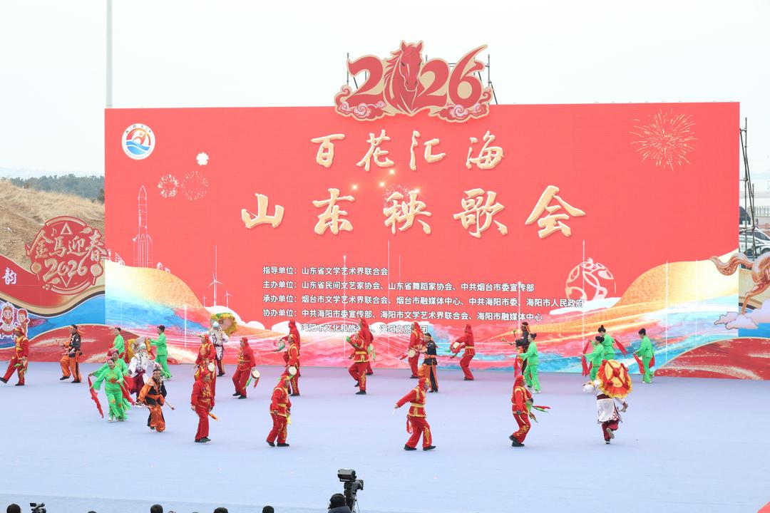 3月1日,2026“百花汇海”山东秧歌会在烟台海阳市河清岛体育场精彩上演。本次活动由山东省文学艺术界联合会指导,山东省民间文艺家协会、山东省舞蹈家协会、中共烟台市委宣传部主办,旨在集中展示各地秧歌艺术的传承发展成果,推动山东传统民间舞蹈在新时代焕发蓬勃生机。
