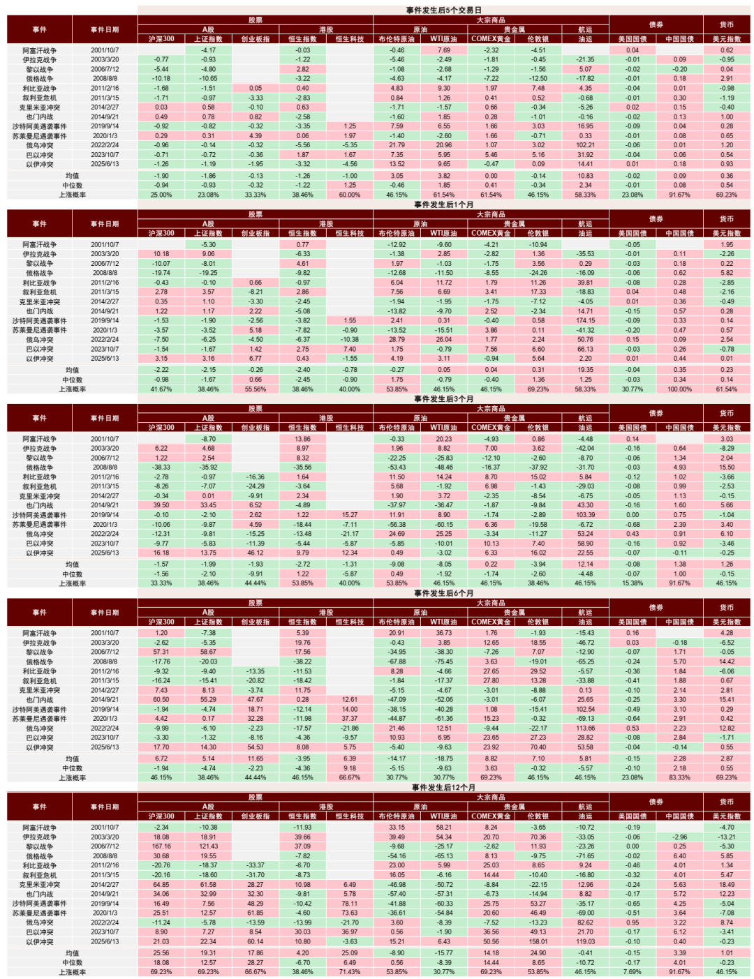 短期内,地缘冲击对股市的首轮冲击通常体现为情绪冲击和风险溢价跳升,表现为波动率上升与资金再配置。在不确定性显著上升的环境下,资金倾向于从权益资产转向黄金和美债等避险资产;近几次地缘冲突多与产油国有关,受供给冲击影响,原油等能源价格同步走高;股市面临阶段性下行压力。历史经验显示,冲突爆发或升级后的首周,WTI原油和COMEX黄金的涨幅中位数分别约为1.9%和0.4%,上涨概率均约为61.5%;同期A股沪深300和上证指数的涨幅中位数约为-1%,上涨概率仅为25%和23%。