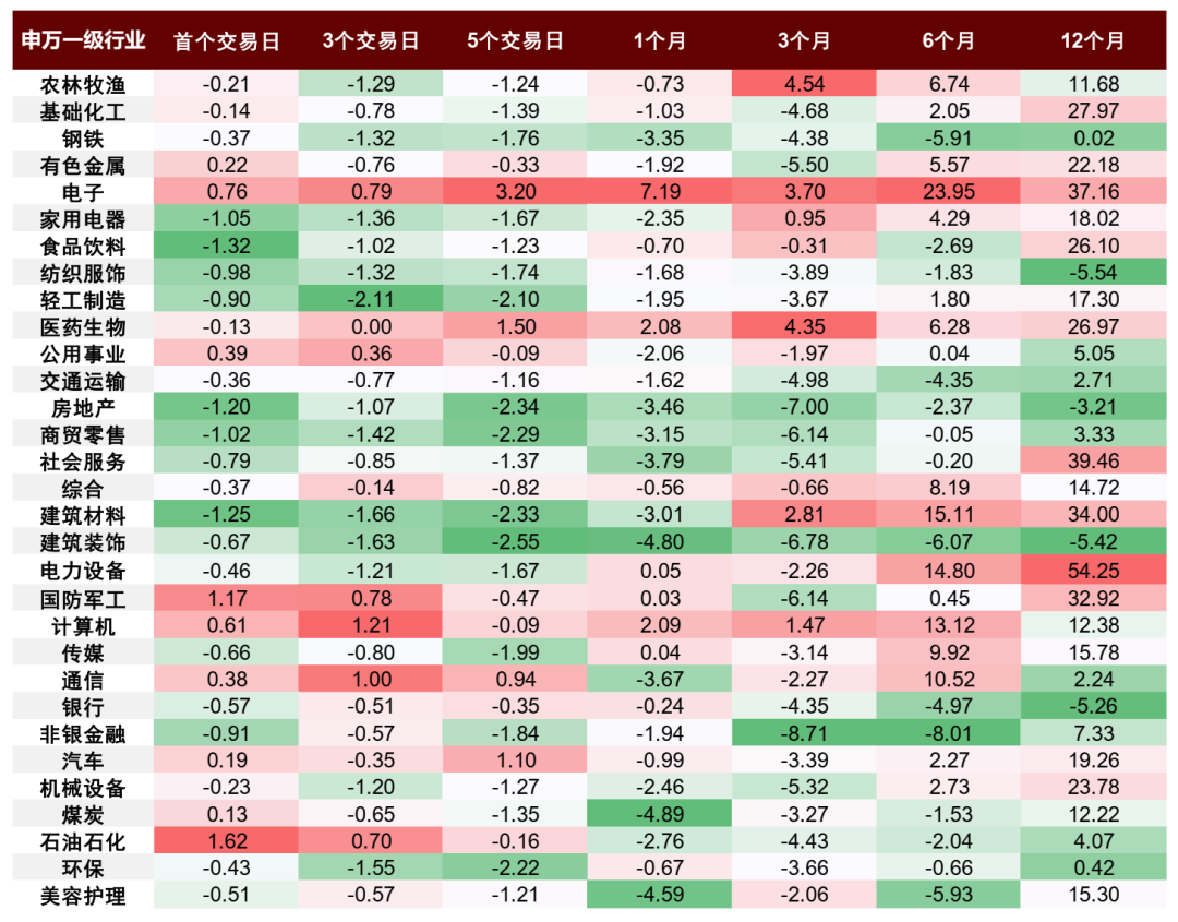 从行业层面看,地缘冲突初期多数行业受情绪影响或有短线回调,石油石化、国防军工及有色金属等板块相对抗跌;中长期影响十分有限。短期内,受益于风险溢价上升与供给预期扰动,石油石化、国防军工及有色金属等板块多有相对表现甚至取得绝对收益;但从历史经验看,这类超额表现多呈阶段性特征。随着情绪冲击消退与供给预期修正,行业表现通常回归基本面主线,地缘冲突对我国行业长期趋势的影响有限。