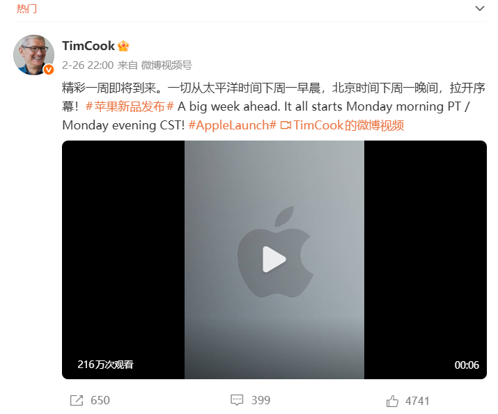 2月26日,苹果 CEO库克就在社交媒体发文表示:精彩一周即将到来,北京时间下周一晚间,拉开序幕。