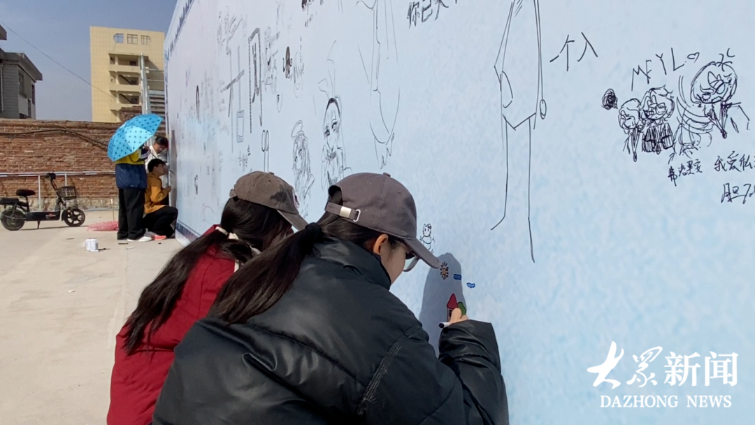 沂源的动漫爱好者在剧院西侧绘制墙绘。