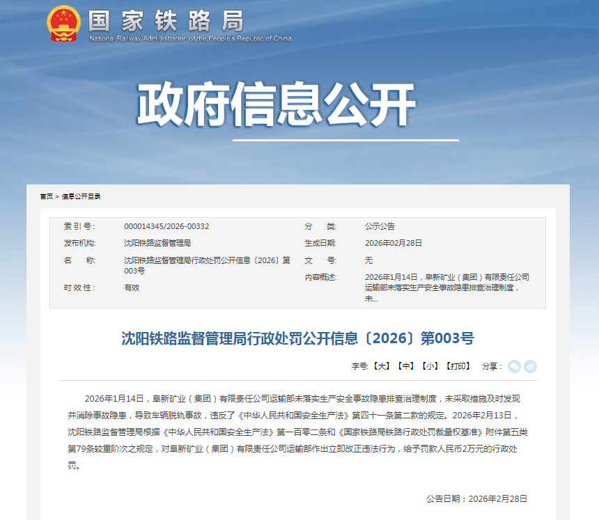齐鲁晚报·齐鲁壹点记者于国家铁路局政府信息公开栏了解到,2月28日,其公示了沈阳铁路监督管理局行政处罚公开信息〔2026〕第003号。据悉,被行政处罚单位为阜新矿业(集团)有限责任公司(下称“阜矿集团”)运输部。