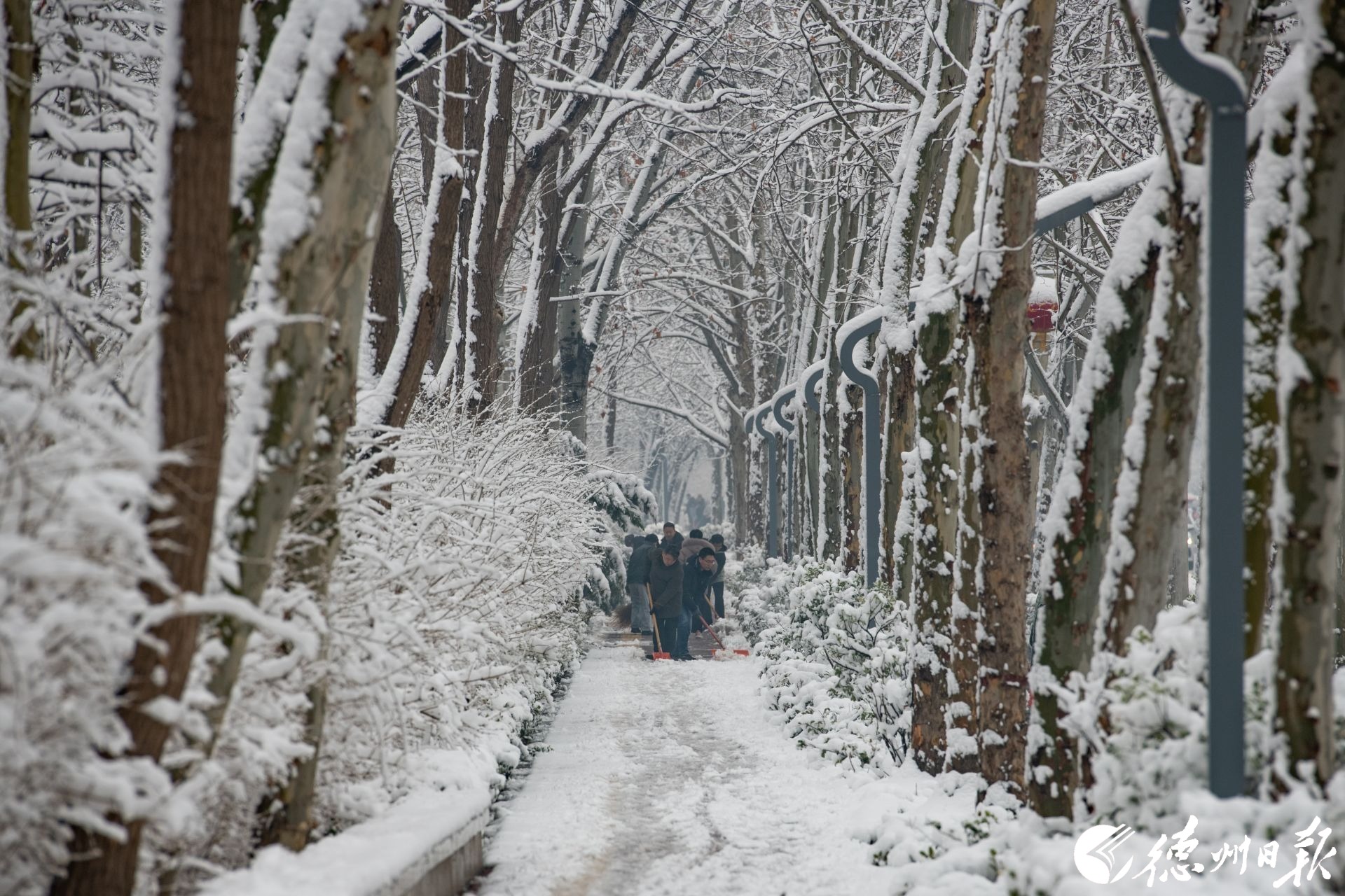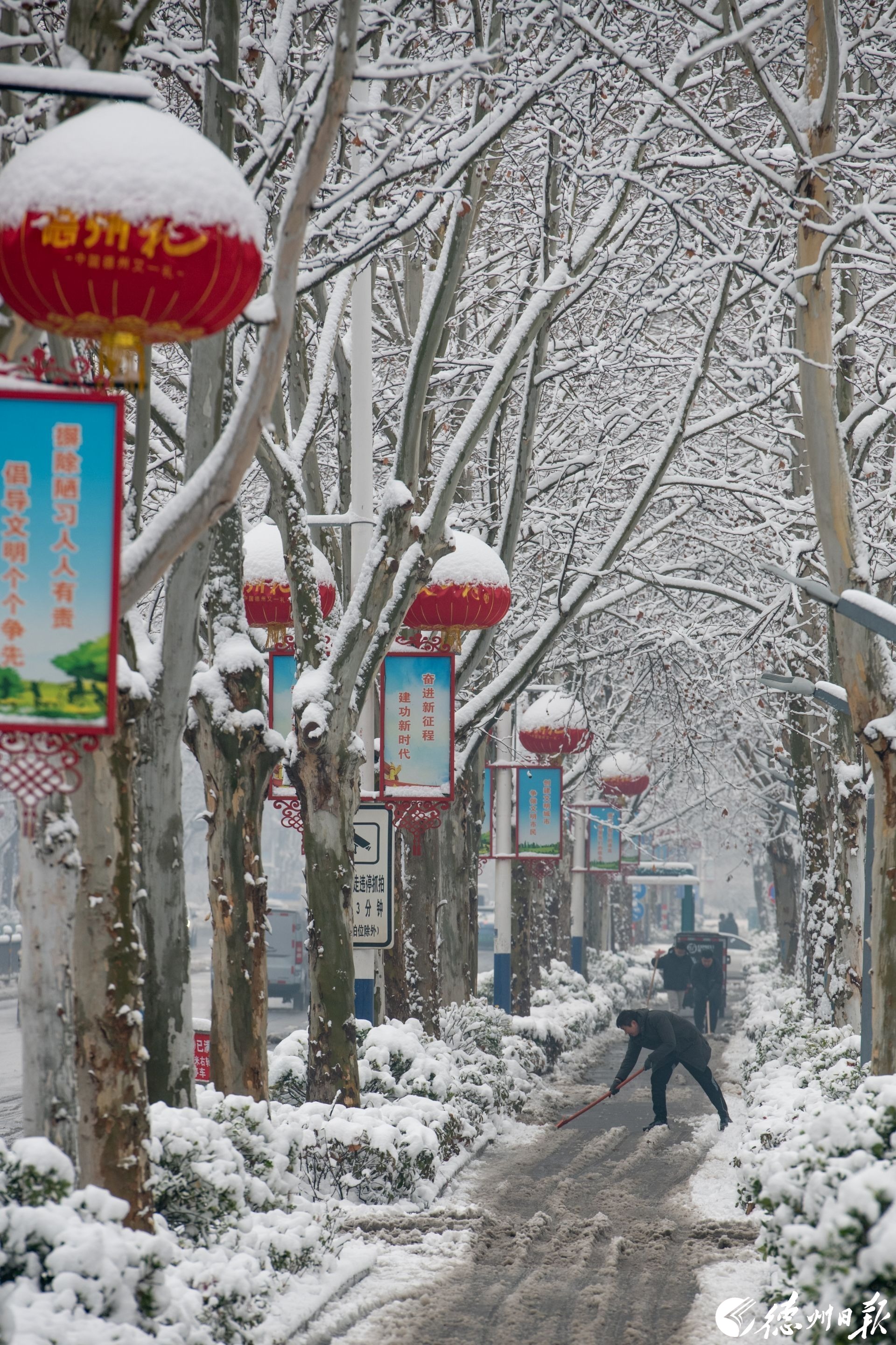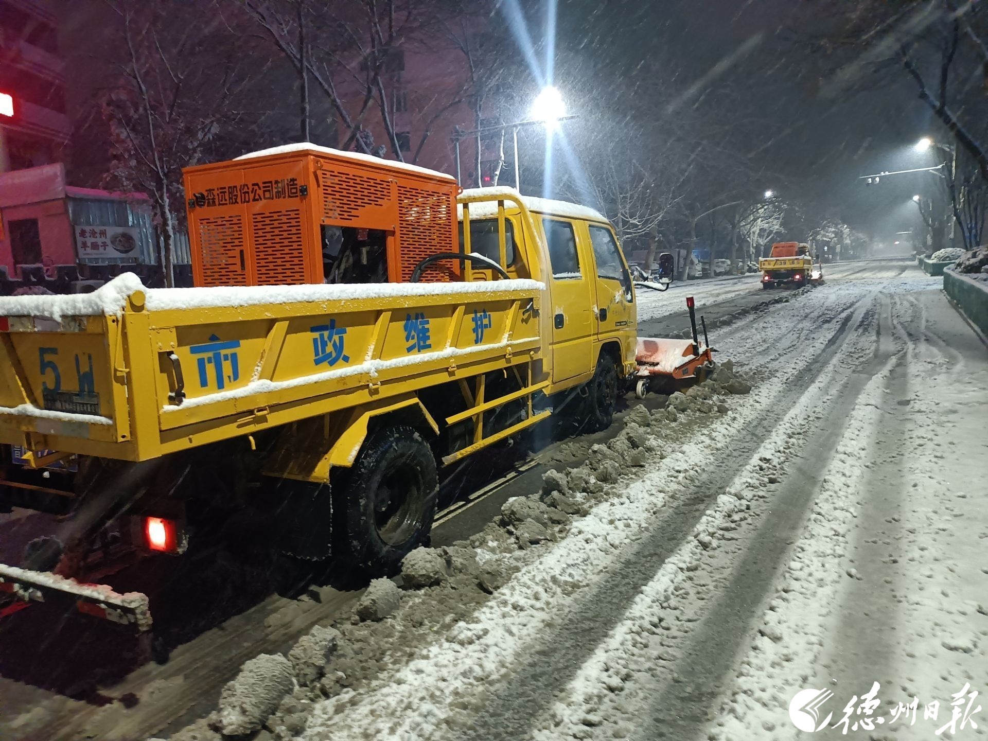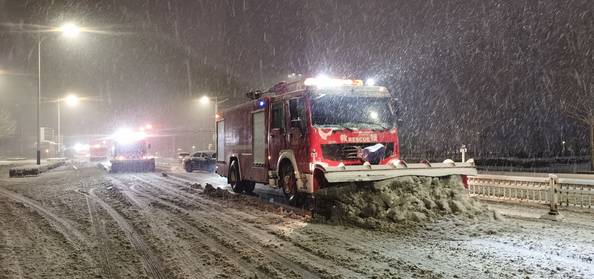 大雪如约而至,各部门积极行动。市城管局提前部署行动,组建由2300余人组成的抢险队伍,储备融雪剂592余吨,准备大型清雪车辆235台。市公安交管部门迅速启动恶劣天气应急预案,全体民警辅警以雪为令、闻雪而动,坚守路面一线。德州市消防救援局迅速出动8辆消防车、28名指战员连夜在广川大道、晶华大道开展铲雪作业,全力保障道路畅通与市民出行安全。各单位组织人员打扫责任路段。