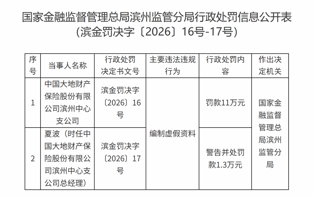 近日,国家金融监督管理总局滨州监管分局发布了行政处罚信息公开表,对中国大地财产保险股份有限公司(下称“大地财险”)滨州中心支公司及其相关责任人开出了罚单。