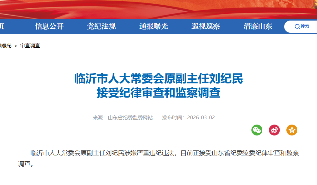 临沂市人大常委会原副主任刘纪民被查打虎拍蝇猎狐 | 2026-03-02 14:47:06 微信扫码扫码下载客户端3月2日,据山东省纪委监委网站消息:临沂市人大常委会原副主任刘纪民涉嫌严重违纪违法,目前正接受山东省纪委监委纪律审查和监察调查。责任编辑:陈修华