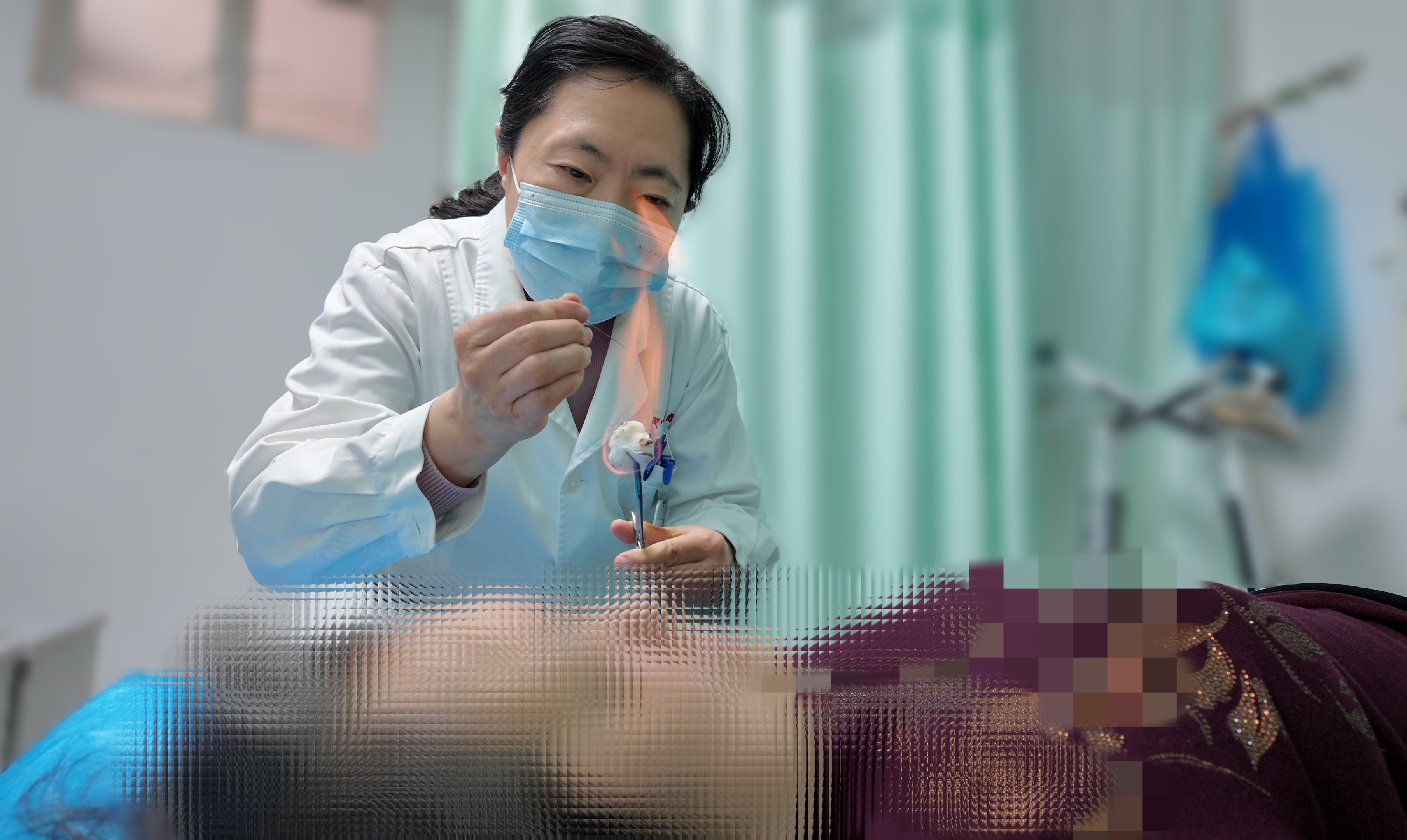 此时,患有重度静脉曲张的复诊患者刘女士已经躺上诊疗床,其小腿部位仍能看到少许迂曲的血管痕迹。高霞手持烧得通红的火针,瞄准病变部位,快速点刺,整套动作干净利落,快到几乎看不清针的轨迹。过程中,刘女士多次反应“舒服多了,感觉轻快”。
