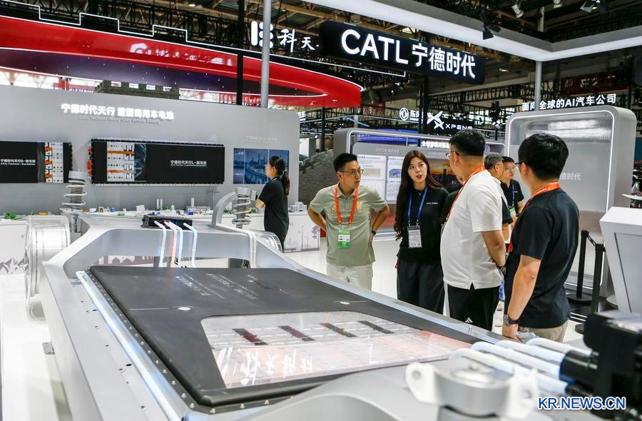 지난해 7월 16일 '제3회 중국국제공급사슬엑스포(CISCE)' 스마트자동차사슬 전시구역에 전시된 닝더스다이(寧德時代·CATL) 선싱(神行)플러스 배터리. (사진/신화통신)