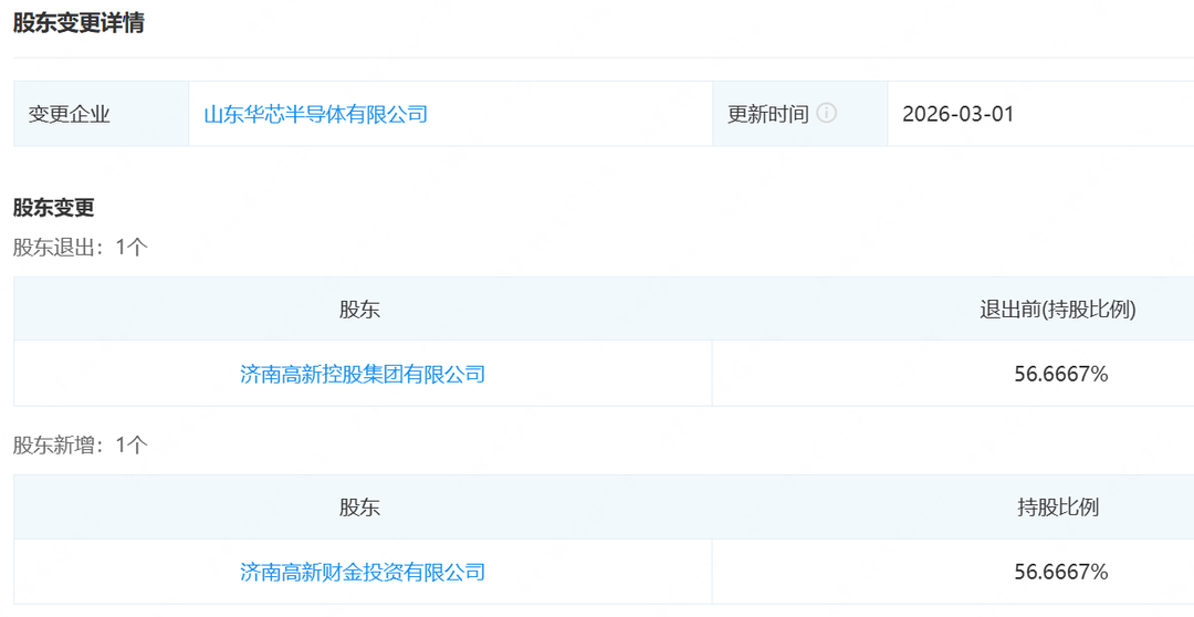 企查查显示,日前,济南高新控股集团有限公司(下称“济高控股”)退出山东华芯半导体有限公司(下称“华芯半导体”),退出前持股比例为56.67%,该部分股权由济高控股旗下济南高新财金投资有限公司(下称“济高财金”)接手。