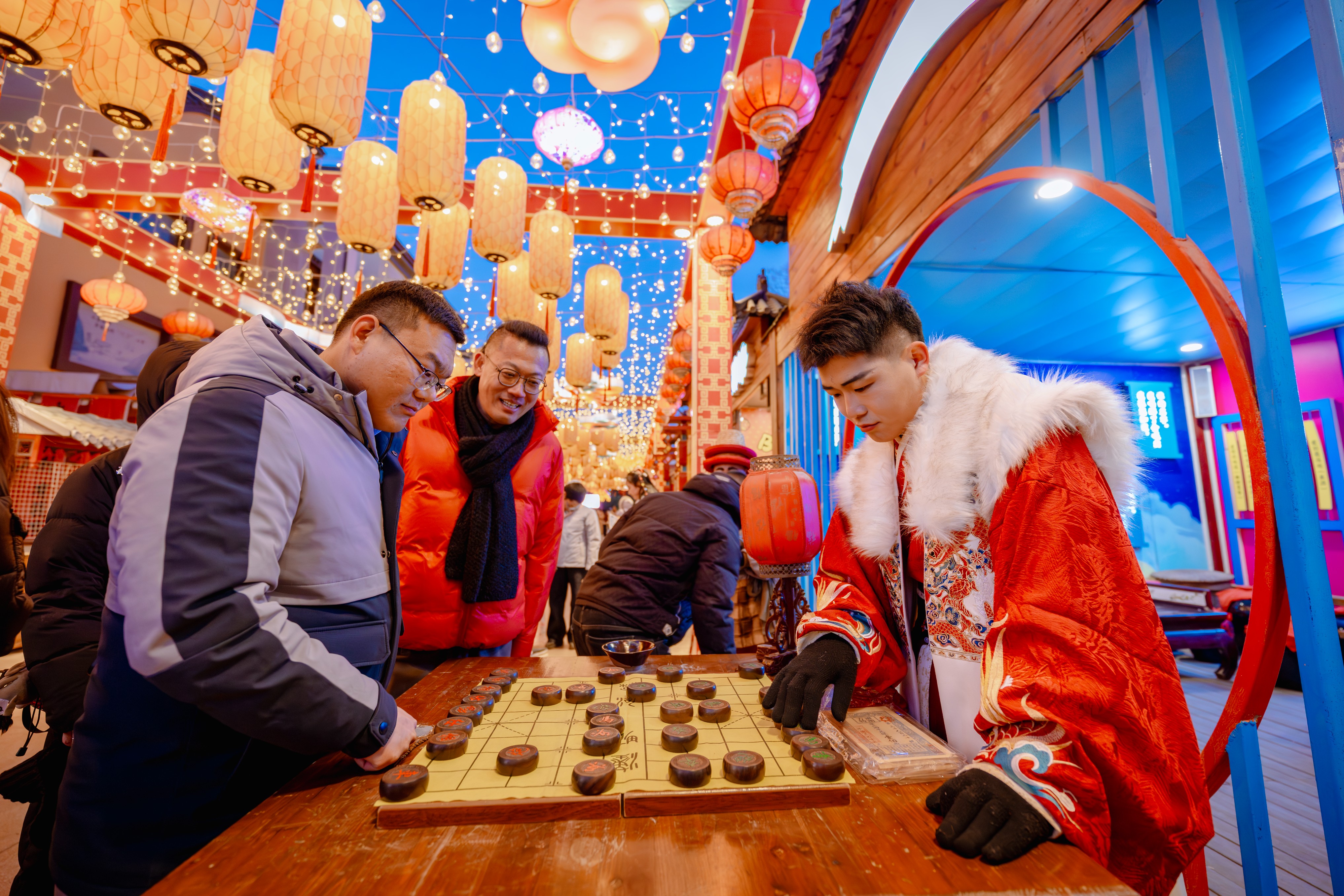 在广饶孙子文化园,“灯火奇幻夜”深挖兵圣文化,推出“孙武传奇”等十三个主题灯光秀场景,让游客沉浸在视觉盛宴中,结合日间“马到福来”新春游园会,非遗演艺武韵·秧歌等民俗演艺接连上演,木匠师傅、将军大人等NPC角色全程互动伴游,带来沉浸式游园体验。明水古城以“易安灯会”为主题,打造水陆灯景,千盏鱼灯点亮夜空,再现 “一夜鱼龙舞” 的宋韵意境,白天这里是一座没有边界的剧场,游客服务中心广场、明水大街、泉秀广场、狐仙居广场等多个客流节点,设有流动表演点位,武术、民乐、杂技与NPC情景互动交织上演,让游客在漫步中随时与惊喜相遇。
