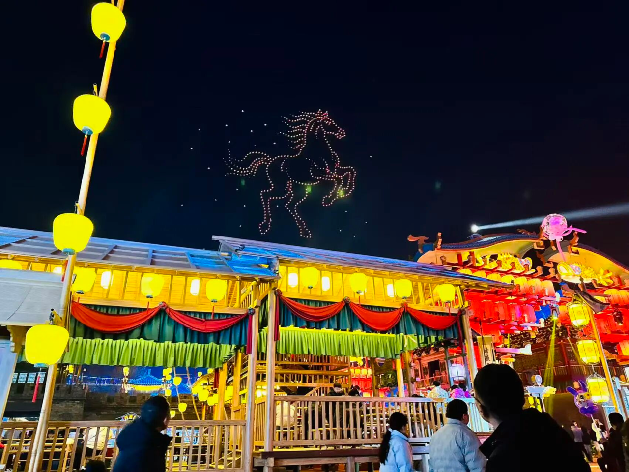 元宵节当晚,泉城欧乐堡、济宁运河记忆街区、烟台胶东文化广场、东平新大宋不夜城等地,都会上演无人机秀。以夜空为幕布,用灯光做画笔,把科技和传统元素结合起来,场面震撼,氛围感十足。在聊城东宛园,《水幕电影》光影交错,带游客走进梦幻之境,白天还有智能机器人跳舞,给人未来感……