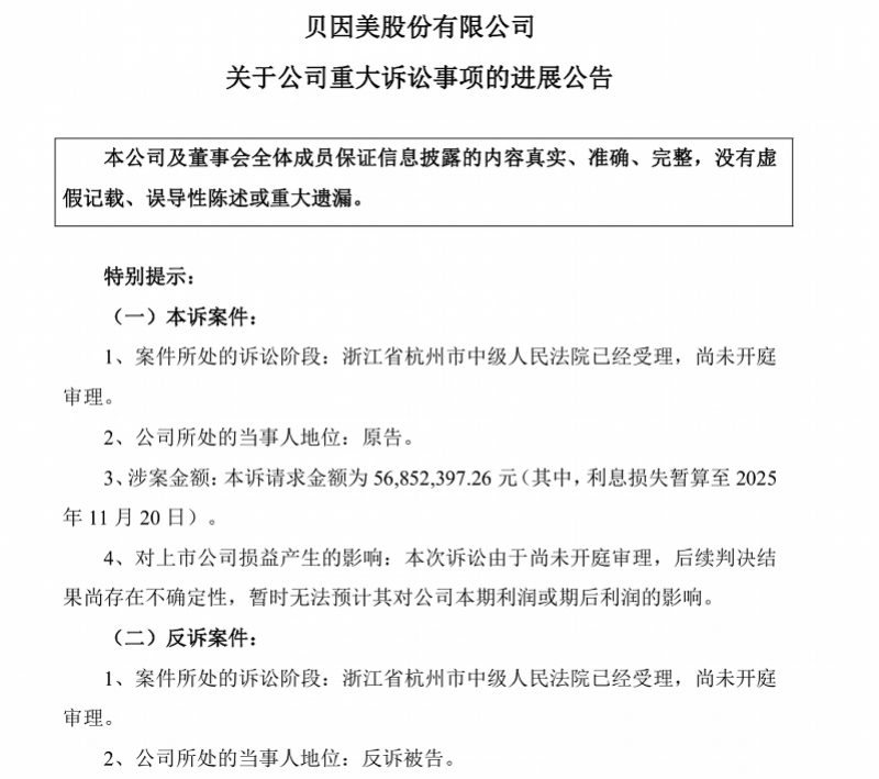 回溯案情,贝因美曾于2025年12月公告,因专利合同纠纷向杭州中院起诉黑龙江丰佑,本诉请求金额为5685.24万元(含暂算至2025年11月20日的利息损失)。如今,局面发生逆转,贝因美从原告席被推至反诉被告席。