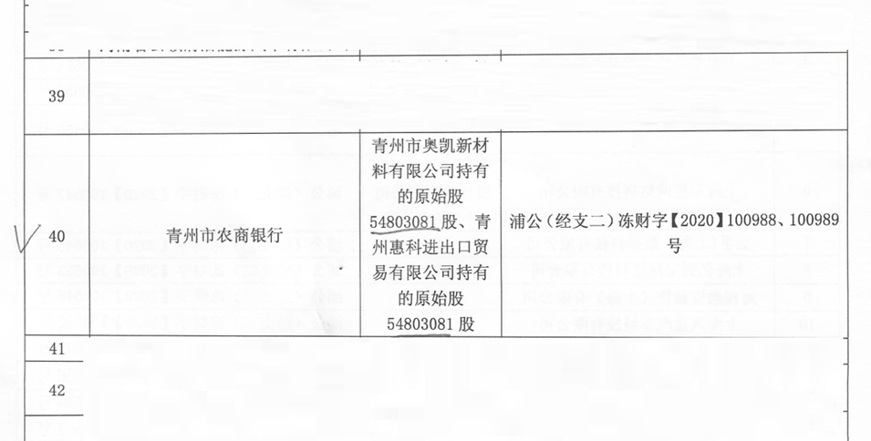 2022年5月底,两家公司对青州农商行的持股被冻结。本次拍卖,标的物介绍中附载的一份上海市第一中级人民法院刑事裁定书显示,两家公司对青州农商行的持股为善林金融一案的涉案财产。