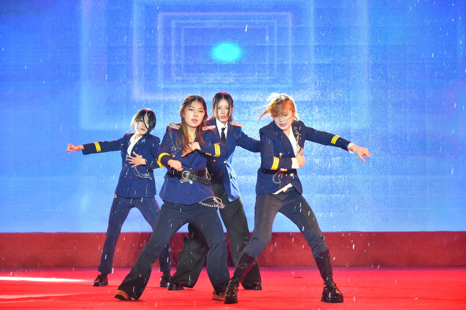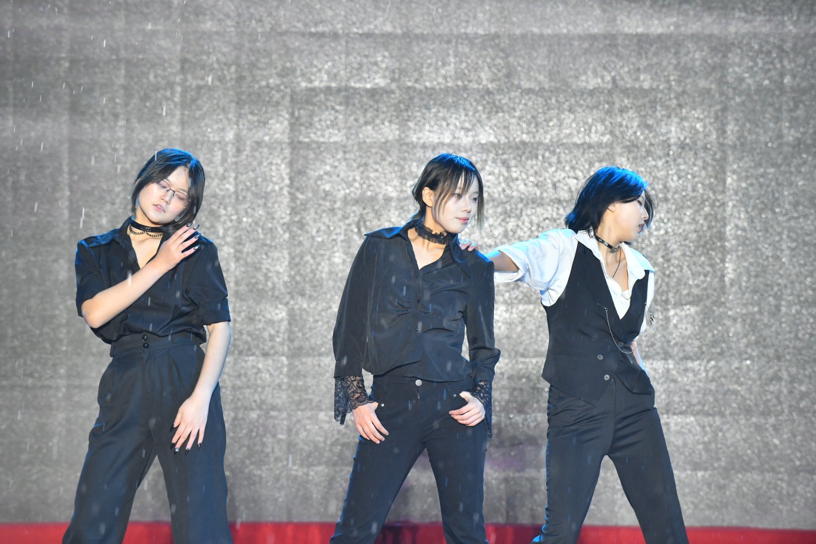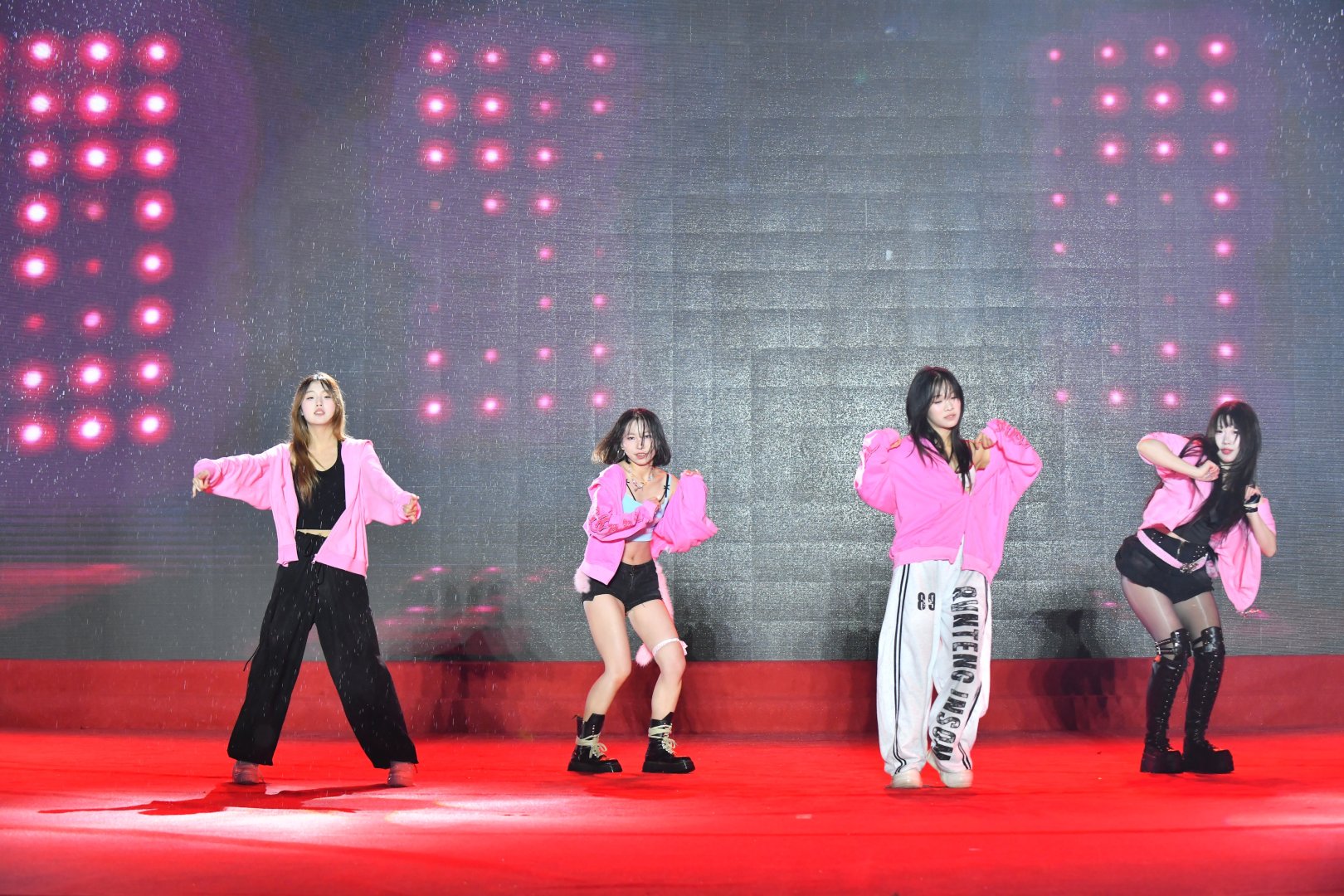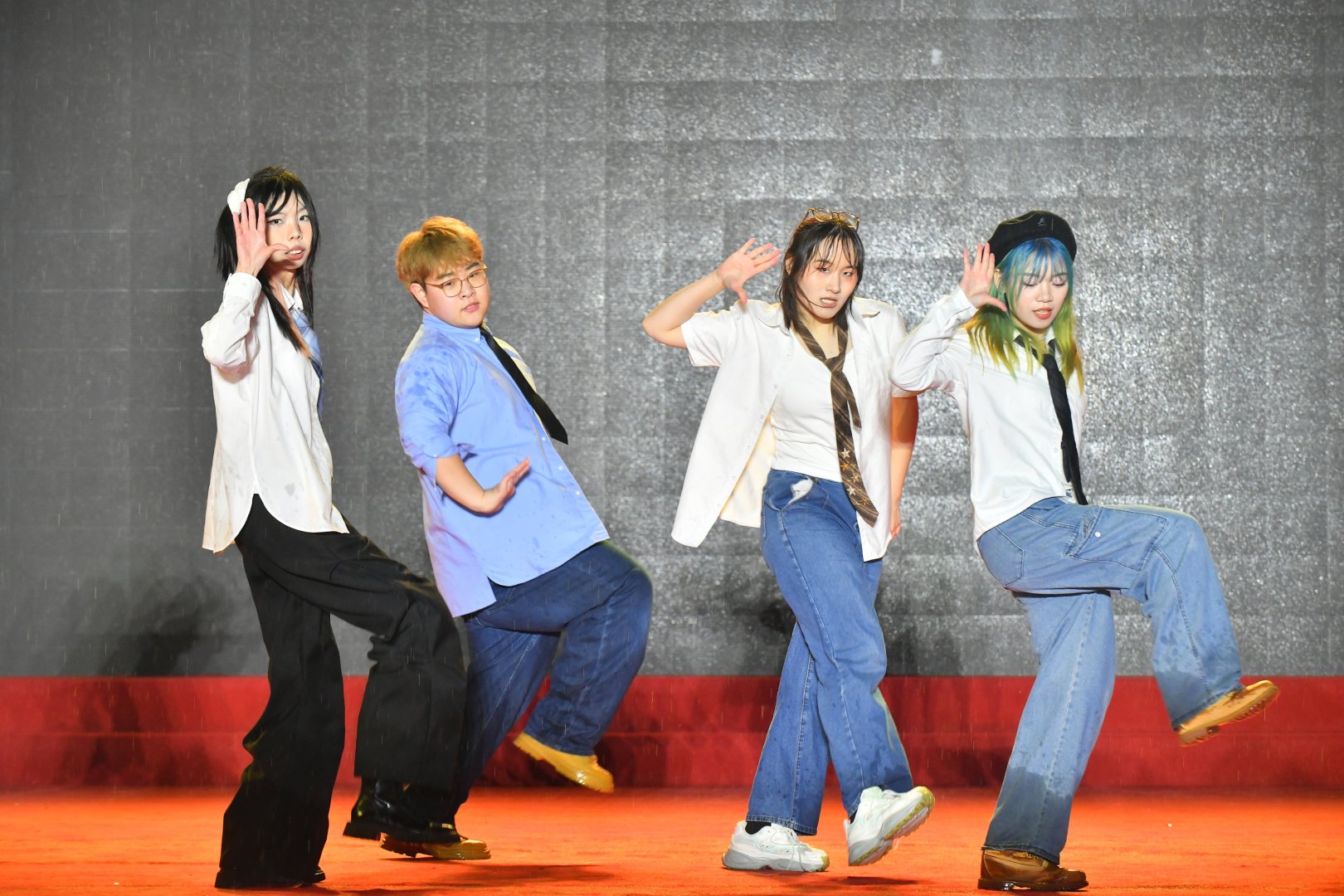 不得不说,这群年轻人的敬业程度简直“瑞思拜”。演出的当天天公不作美,下起了绵绵细雨,但舞台上的大学生们集体开启了“高燃模式”。为了保证舞台效果,大家心照不宣地拒绝了雨棚和雨衣,顶着风雨完成了各种高难度卡点和走位。当熟悉的热门曲目响起,整齐划一的动作配合着台下的尖叫与应援,现场氛围感直接拉满。这哪里是演出,这分明是00后在用热爱向世界宣言:青春,就是要在雨中肆意绽放!