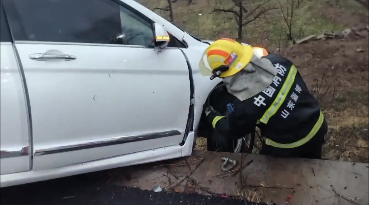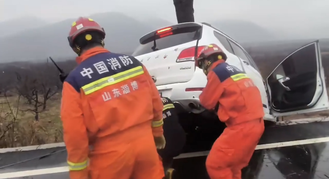 雨雪天路滑车辆失控撞树 淄博消防紧急救援