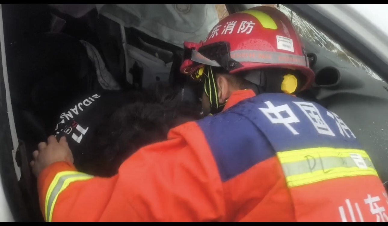 消防救援人员到场后立即与现场人员进行对接,快速核实事故核心信息。经确认,事发路段因突降雨雪,路面湿滑导致车辆在行驶中失控,直接撞击路边行道树,致使主驾驶一侧车身严重变形,驾驶员被困车内,无法自行脱困,但意识保持清醒。