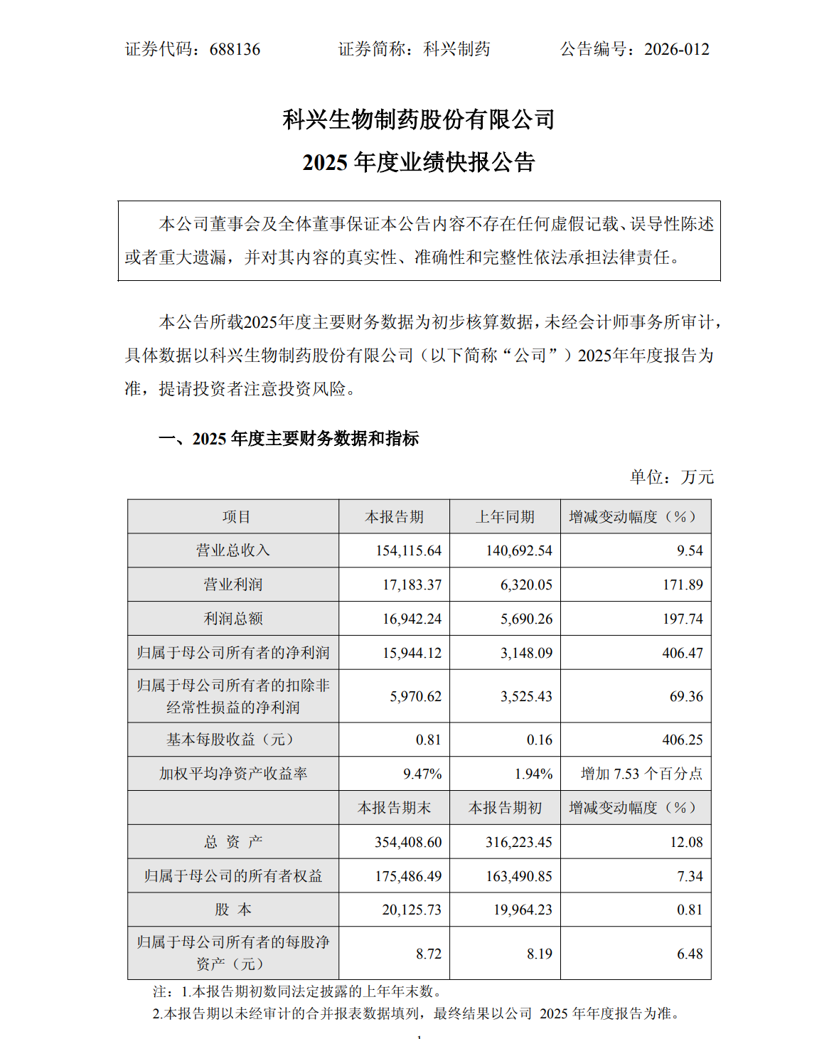 近日,科兴制药(688136.SH)披露的业绩快报显示,2025年,公司实现营业收入15.41亿元,同比增长9.54%;归母净利润1.59亿元,同比大增406.47%;扣非归母净利润为5970.62万元,同比增长69.36%。