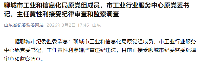 聊城市工业和信息化局原党组成员,市工业行业服务中心原党委书记、主任黄性利接受纪律审查和监察调查打虎拍蝇 | 2026-03-02 17:50:58 微信扫码扫码下载客户端据聊城市纪委监委消息:聊城市工业和信息化局原党组成员,市工业行业服务中心原党委书记、主任黄性利涉嫌严重违纪违法,目前正接受聊城市纪委监委纪律审查和监察调查。责任编辑:周凡婷