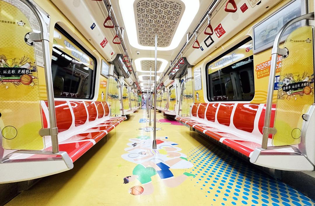 除了视觉上的焕然一新,专列还在细节处暗藏巧思。不少乘客发现,车厢内融入了马卡龙色系的时尚元素,将运动活力与城市风情有机融合,缓解了乘车过程中的枯燥感。一车厢“花路”满满,让心情也随着花色明亮起来;三车厢的运动元素扑面而来,让多巴胺唤醒沉睡的身体;五车厢“哈啤酒、吃嘎啦、小嫚儿”等青岛方言融入其中,让你走的每一步都是想要打卡的风景。