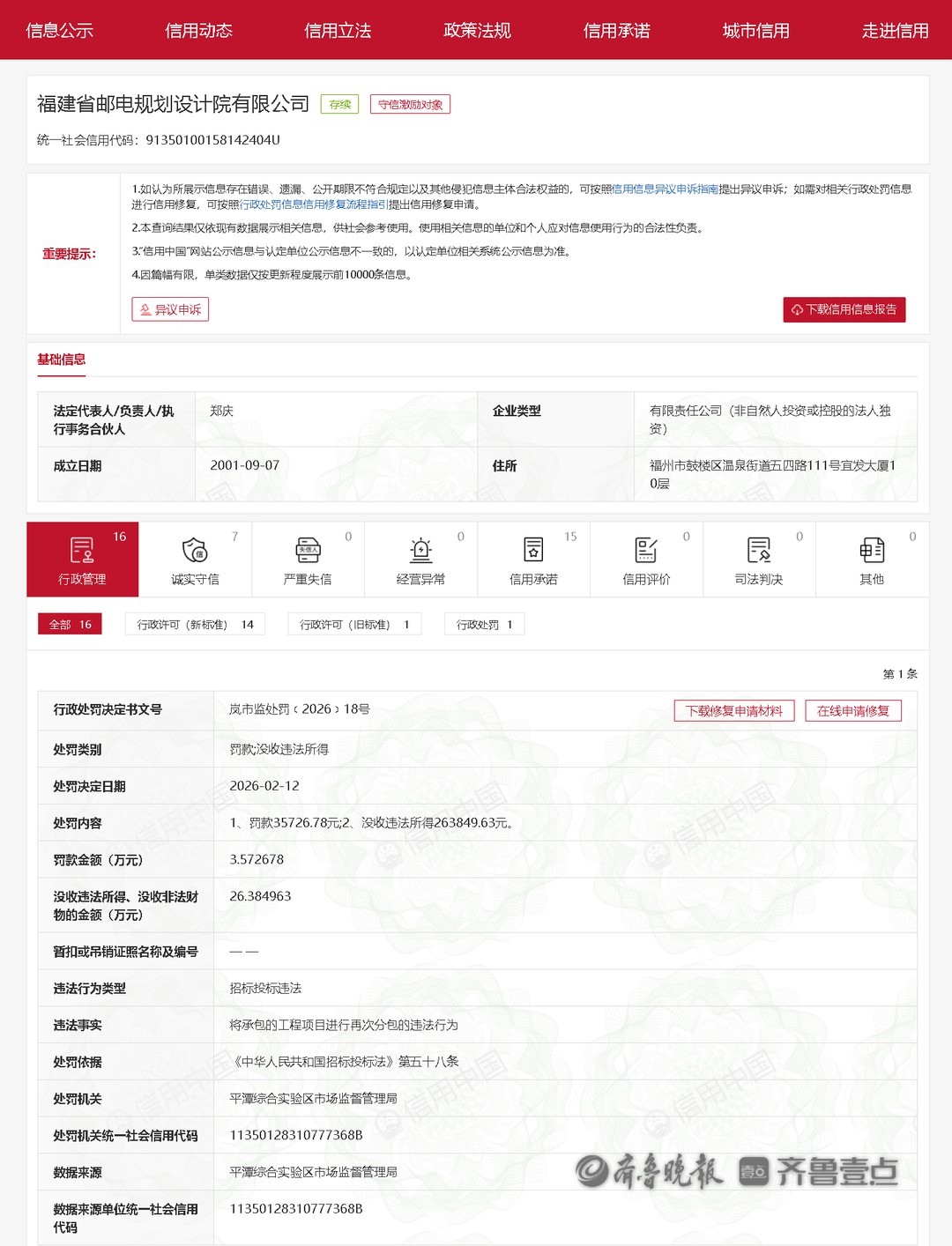 齐鲁晚报·齐鲁壹点记者从信用中国获悉,福建省邮电规划设计院有限公司因将承包的工程项目进行再次分包的违法行为,被平潭综合实验区市场监督管理局罚款35726.78元;没收违法所得263849.63元。处罚决定日期为2026年2月12日。