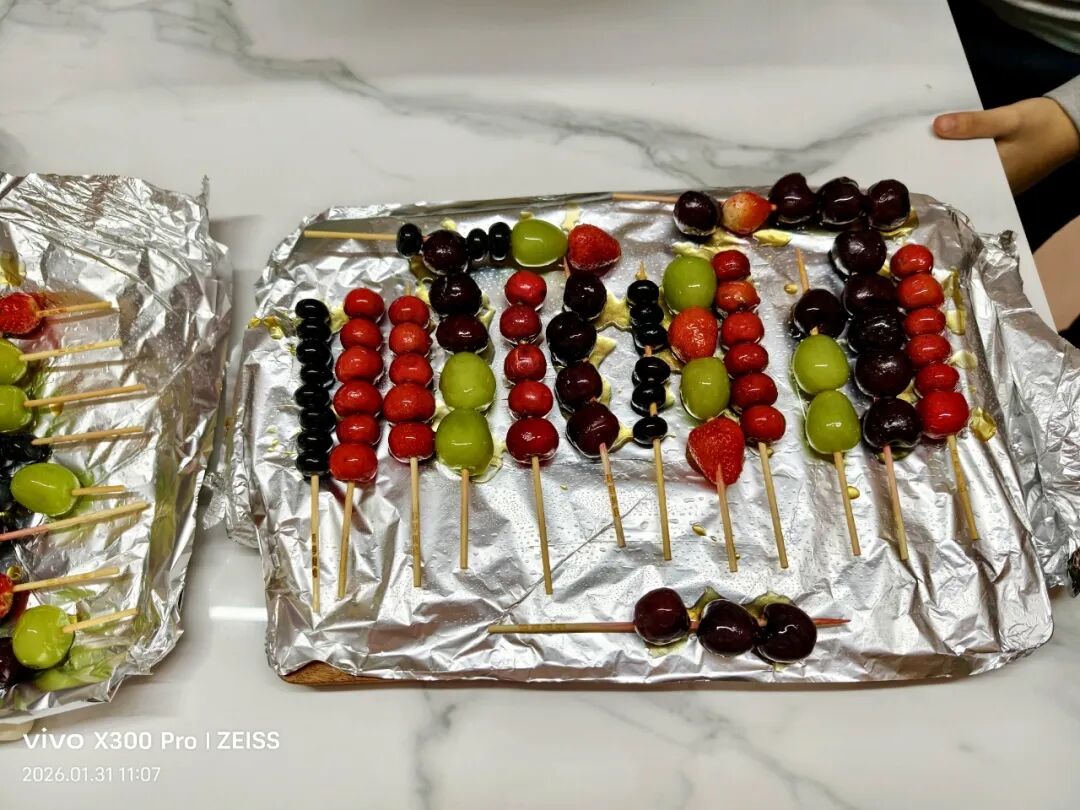 泉韵小队队员们认真学习糖葫芦制作,先耐心完成清洗、去蒂、穿签等步骤。熬糖环节,老师和家长详细讲解火候控制与安全注意事项,孩子们屏息观察,见证糖浆由清变稠、由白转金的过程。当晶莹糖衣裹住鲜果,一串串红艳艳的糖葫芦不仅唤起老济南年味记忆,更让孩子们体会到“慢工出细活”的匠心精神。