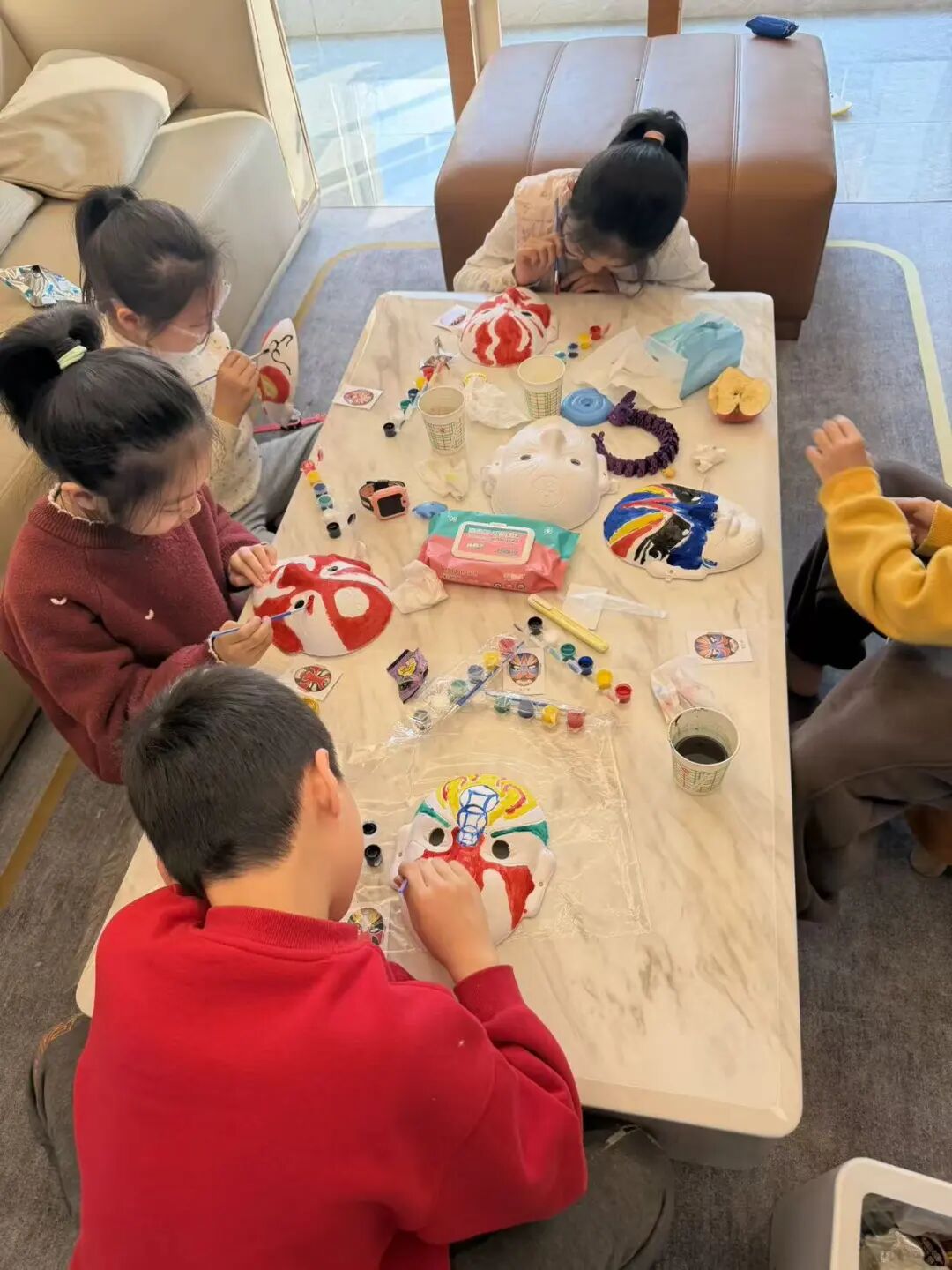 福气满满共同体开展“非遗进家庭”活动,组织队员绘制京剧脸谱。活动中,队员们了解到红忠、黑直、白奸、蓝勇的脸谱色彩象征意义,随后围坐在一起交流思路、分享灵感,有的绘制英勇的关羽,有的挑战复杂脸谱样式。在勾线、填色、描金的过程中,队员们锻炼了审美与专注力,增强了对中华优秀传统文化的认同与热爱。