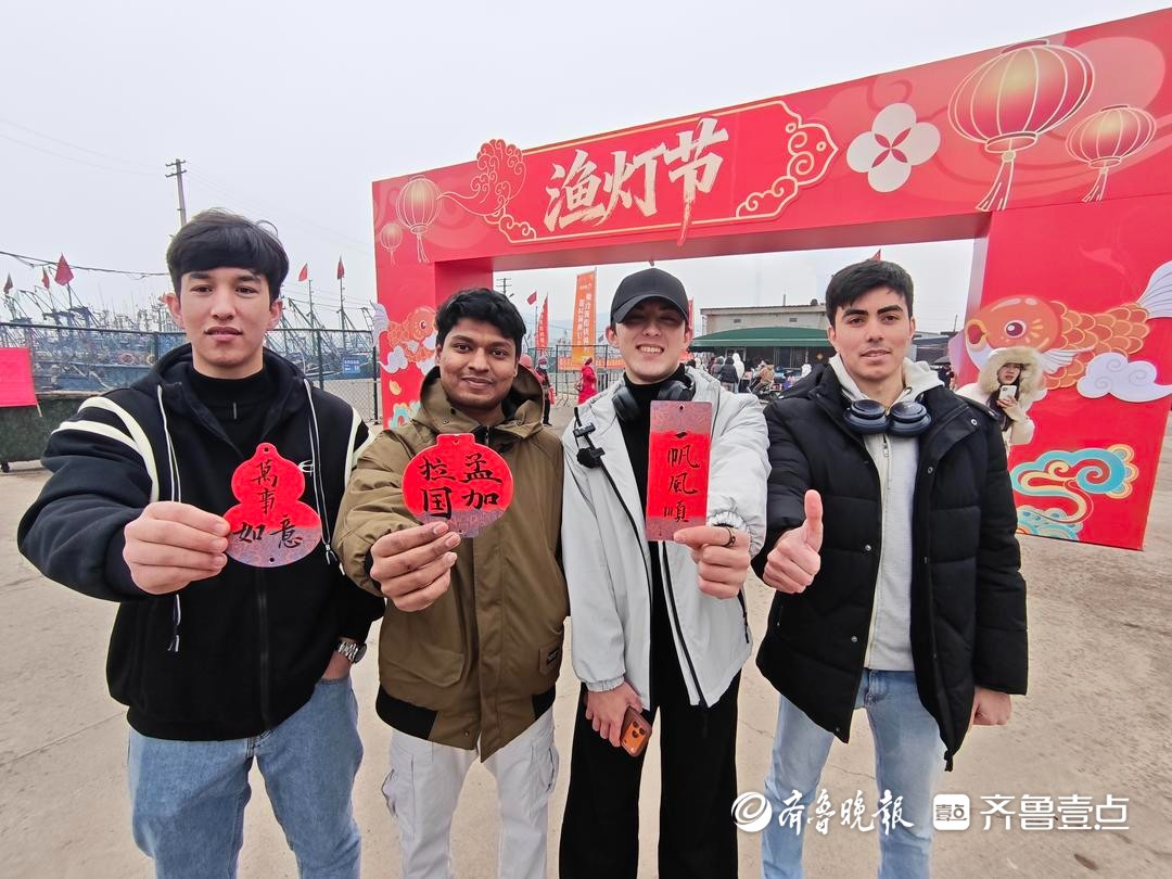 在渔灯节活动现场,还来了不少“洋面孔”。烟台职业学院老师王艺玮带着留学生们来感受渔俗文化,学生们来自塔吉克斯坦、孟加拉国、阿塞拜疆等多个国家。来自塔吉克斯坦的留学生李明赫用中文说:“第一次来渔灯节,感觉特别有意思,很快乐。”