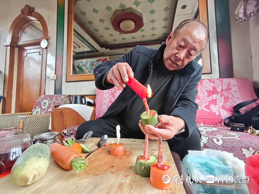 祭海大典活动结束后,初名禹在家中制作传统萝卜灯