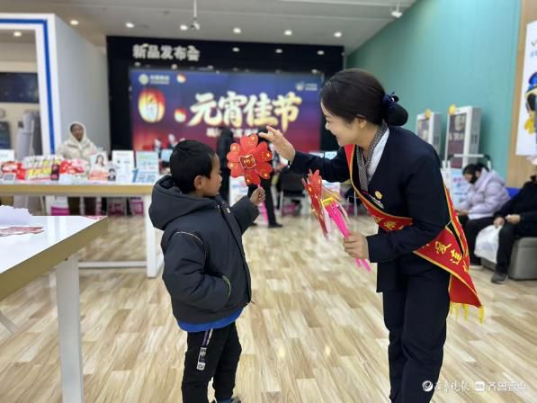 活动现场,工作人员身着整齐制服,以昂扬饱满的精神面貌、亲切热忱的服务态度,迎接每一位到店客户。办理业务的间隙,互动游戏区欢声笑语不断,猜灯谜、趣味闯关等环节妙趣横生;服务台旁,香甜的元宵、精致的灯笼与寓意吉祥的风车依次排开,工作人员将这份份满载祝福的礼品送到客户手中,在一来一往的互动中,悄然拉近了与客户的距离。