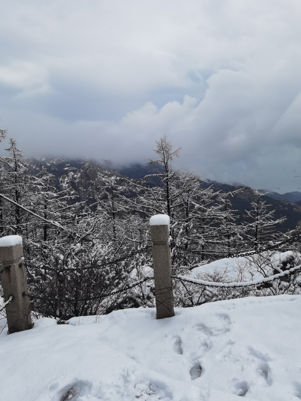 山海相依的独特地貌搭配皑皑白雪,勾勒出一幅绝美的冬日水墨画卷。