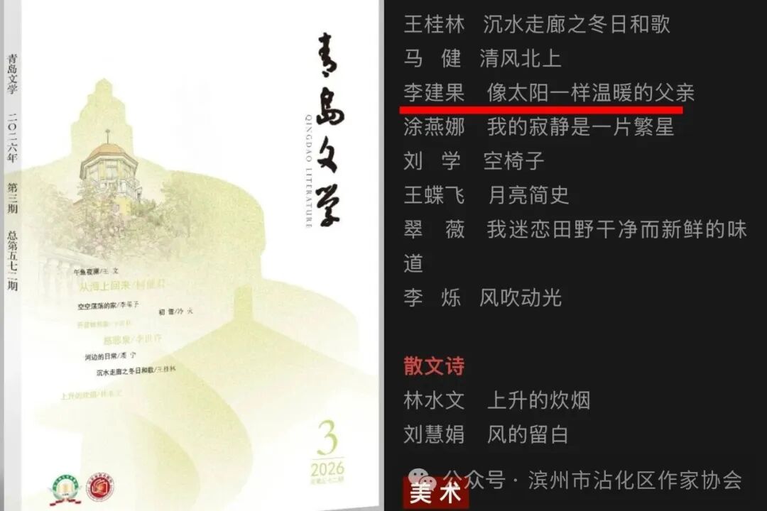近日,从《青岛文学》编辑部传来喜讯,滨州市沾化区诗人李建果的组诗《像太阳一样温暖的父亲》在该刊正式发表。这位扎根沾化乡土的全职妈妈,以女性特有的细腻感知与赤子般的深情,将对父亲的追忆、对故土的眷恋,凝练成四首直抵人心的诗作,在众多来稿中绽放独特光彩。