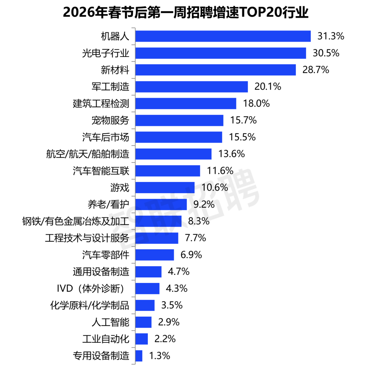 从招聘趋势看,新质生产力产业已成为2026年春招市场驱动人才需求增长的主力,展现出强劲的人才吸纳能力。春节后首周,机器人行业以31.3%的职位数同比增速领跑全行业,成为春招启动阶段最活跃的行业;光电子行业、新材料、军工制造紧随其后,增速分别达30.5%、28.7%、20.1%,均保持高位增长态势。与此同时,航空/航天/船舶制造、汽车智能互联、通用设备制造、IVD(体外诊断)、人工智能、工业自动化等领域的招聘需求也同步释放,增速分别为13.6%、11.6%、4.7%、4.3%、2.9%、2.2%。这一格局清晰表明,以新一代信息技术、高端装备与智能制造、先进材料、新能源汽车、新能源、航空航天、船舶与海洋工程、生物技术与生命科学等为代表的新质产业正形成人才吸纳的新增长极,成为春招阶段企业扩岗、人才择业的核心方向。