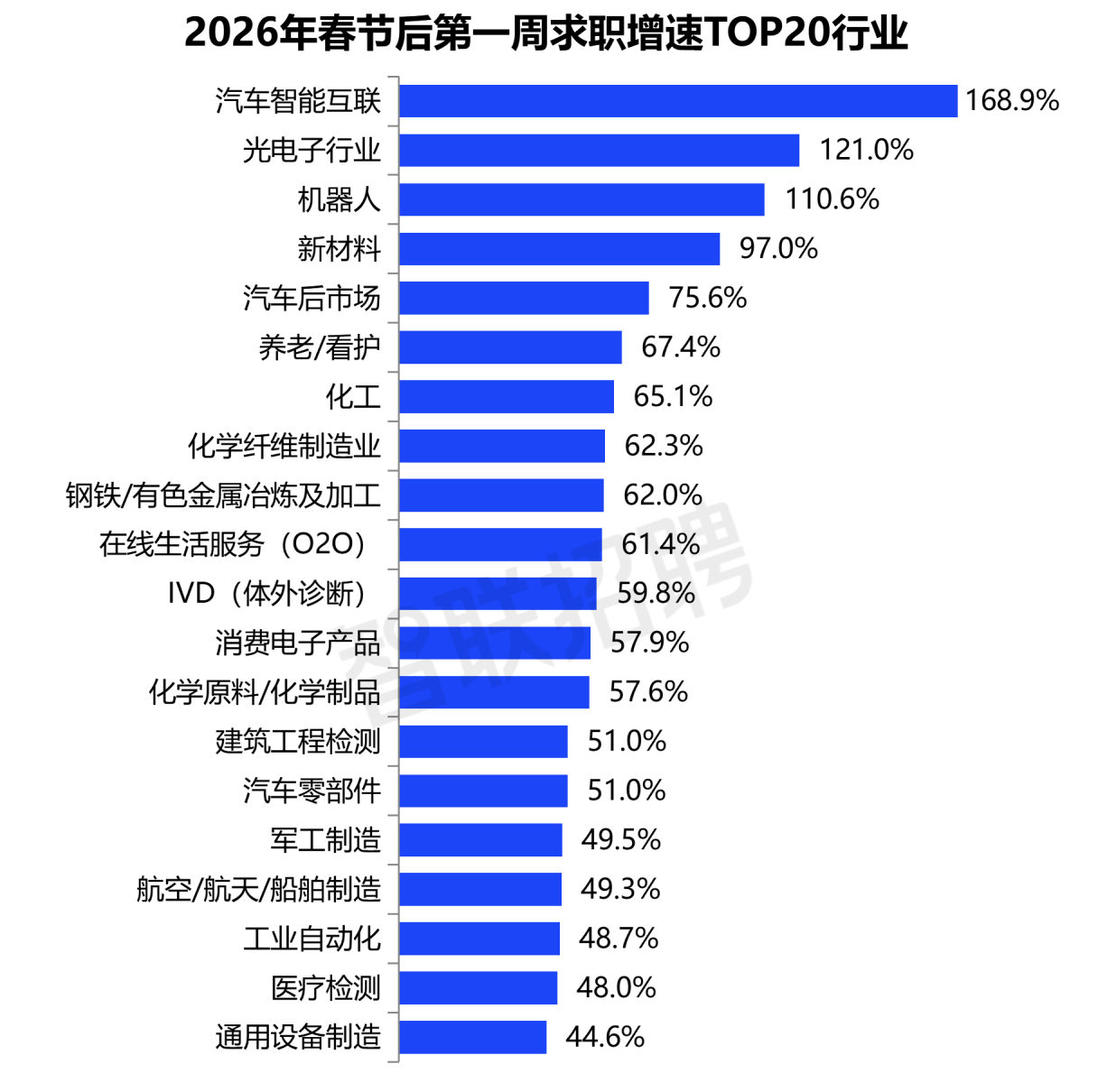 从求职趋势看,求职者对新质产业的热度同样与需求端形成呼应。2026年春节后首周,求职增速TOP4赛道均被新质产业包揽,其中汽车智能互联行业以168.9%的求职人数同比增速遥遥领先,光电子行业、机器人、新材料行业紧随其后,增速分别达121.0%、110.6%、97.0%,足见新质产业对人才的吸引力大大提升。与此同时,汽车后市场、养老/看护、在线生活服务(O2O)等行业的求职热度也同步攀升,求职人数同比增速均超60%,反映出服务消费领域的就业吸引力稳步增长。但从整体数据格局来看,以汽车智能互联、光电子、机器人为代表的新质行业,凭借强劲的发展潜力,牢牢占据求职市场的主流地位,成为推动人才流动的核心驱动力。