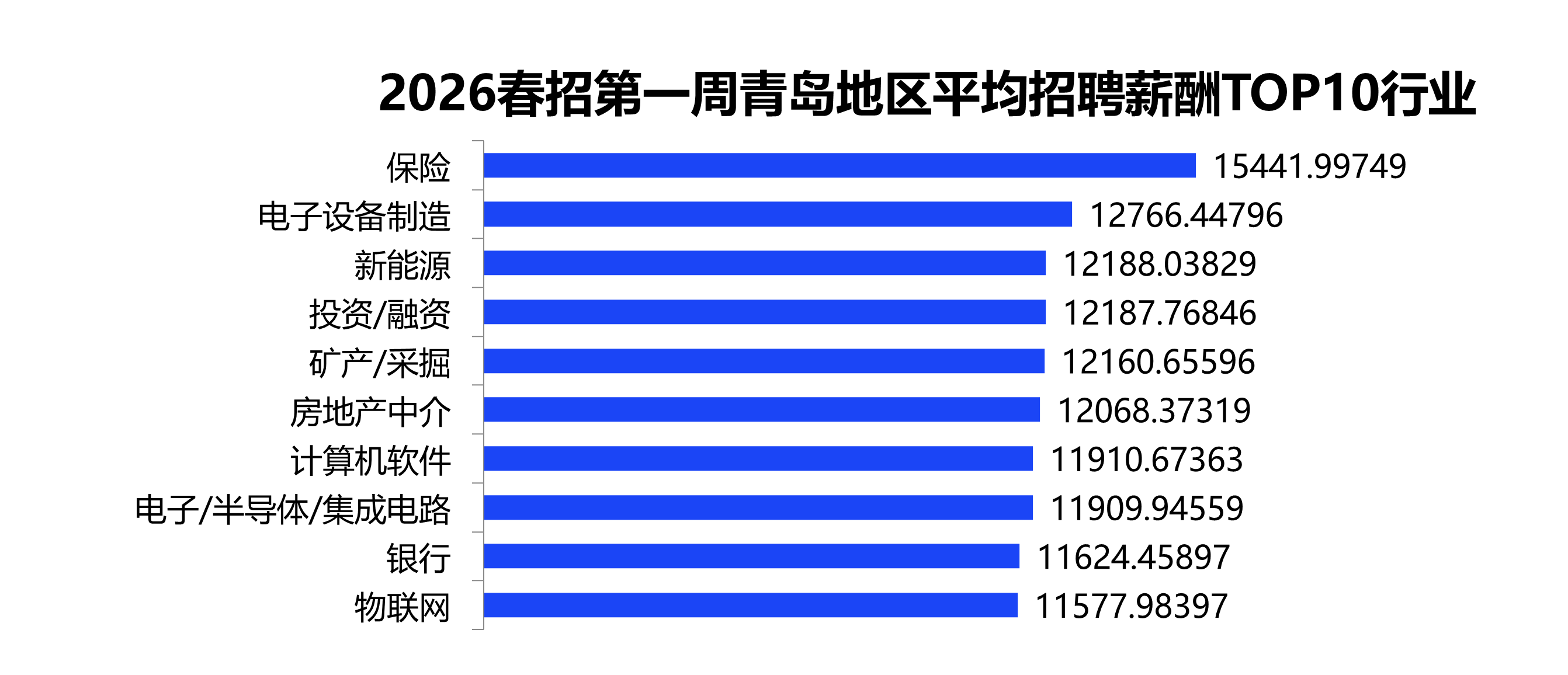 2026春招第一周,青岛地区平均招聘薪酬TOP10行业,分别是保险15441.99元/月、电子设备制造12766.44元/月、新能源12188.03元/月、投资/融资12187.76元/月、矿产/采掘12160.65元/月、房地产中介12068.37元/月、计算机软件11910.67元/月、电子/半导体/集成电路11909.94元/月、银行11624.45元/月、物联网11577.98元/月。