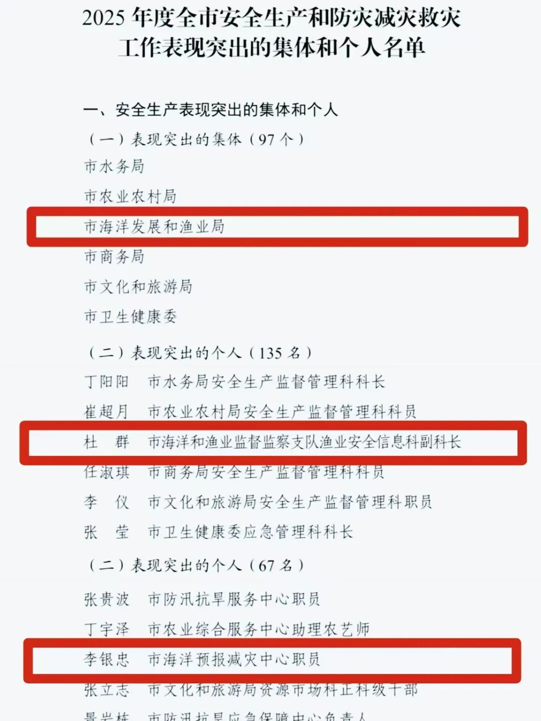 近日,东营市安全生产委员会、防灾减灾救灾委员会印发《关于表扬2025年度全市安全生产和防灾减灾救灾工作表现突出的集体和个人的通报》,市海洋发展和渔业局被评为“2025年度全市安全生产工作表现突出的集体”,杜群、李银忠两名同志分别被评为安全生产和防灾减灾救灾工作表现突出的个人。