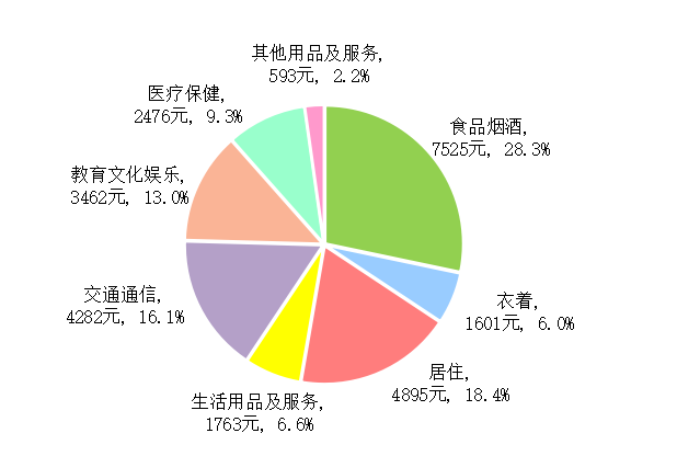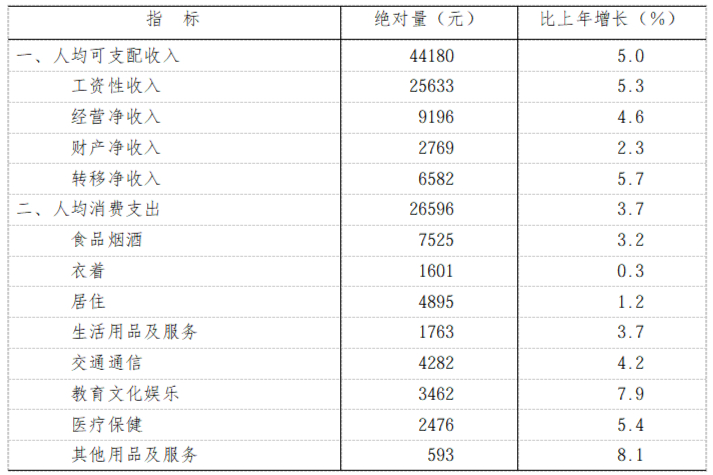 全年全省居民人均可支配收入44180元,比上年增长5.0%。其中,城镇居民人均可支配收入56444元,增长4.4%;农村居民人均可支配收入26613元,增长5.4%。全省居民人均消费支出26596元,增长3.7%。其中,城镇居民人均消费支出32561元,增长3.0%;农村居民人均消费支出18053元,增长4.6%。