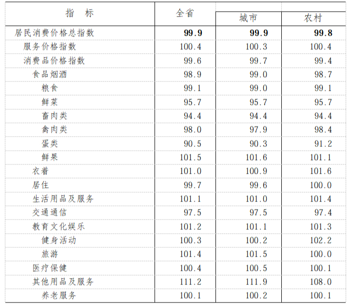 全年居民消费价格比上年下降0.1%。其中,消费品价格下降0.4%,服务价格上涨0.4%;食品价格下降1.9%,非食品价格上涨0.3%。农产品生产者价格下降5.9%。工业生产者出厂价格下降2.5%。工业生产者购进价格下降2.2%。