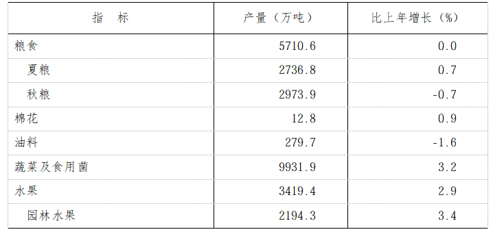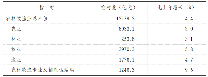 全年农林牧渔业总产值13179.3亿元,按可比价格计算,比上年增长4.4%。粮食生产总体稳定,粮食总产量5710.6万吨,比上年增加0.4万吨。